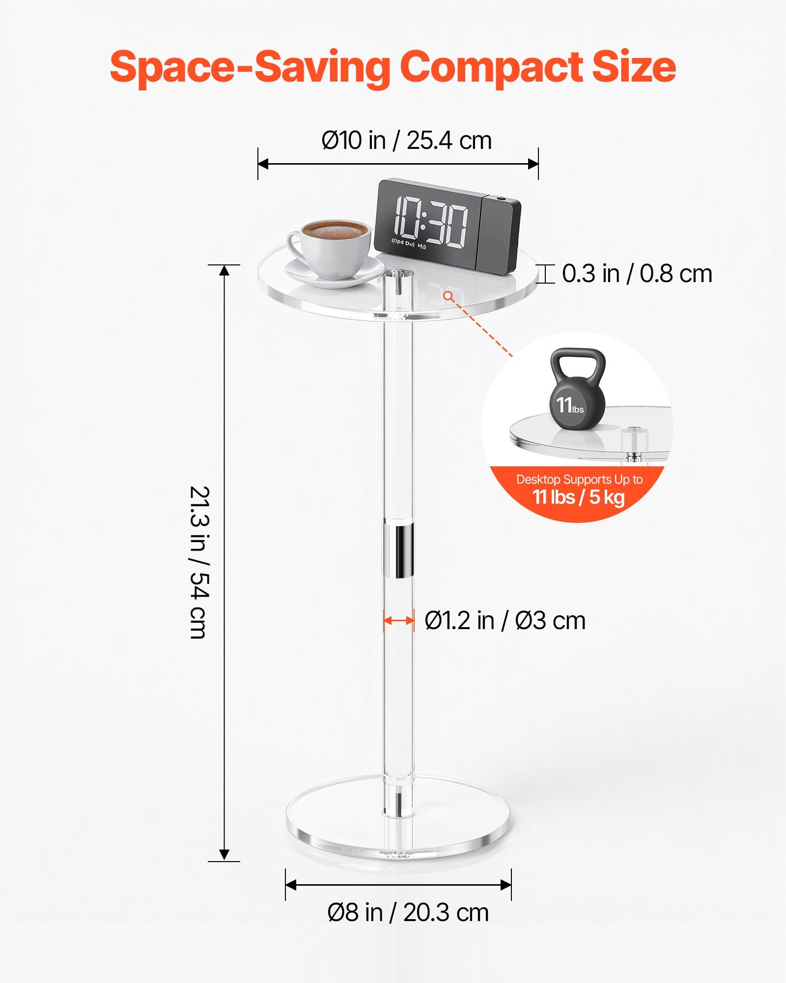 Acrylic Drink Table, Clear End Table Round Top with Solid Post, Modern Acrylic Cake Table Stand, Transparent Side Desk for Coffee, Drink, Food, Snack, Easy Assembly, 10 x 10 x 21.3 in (Clear)