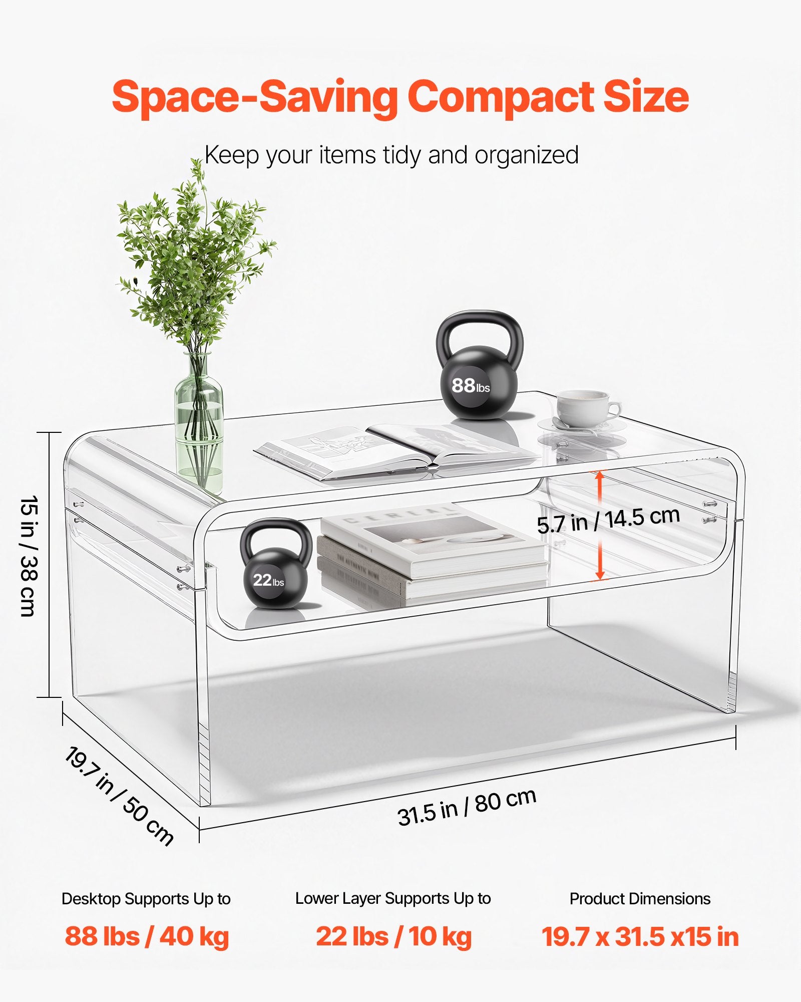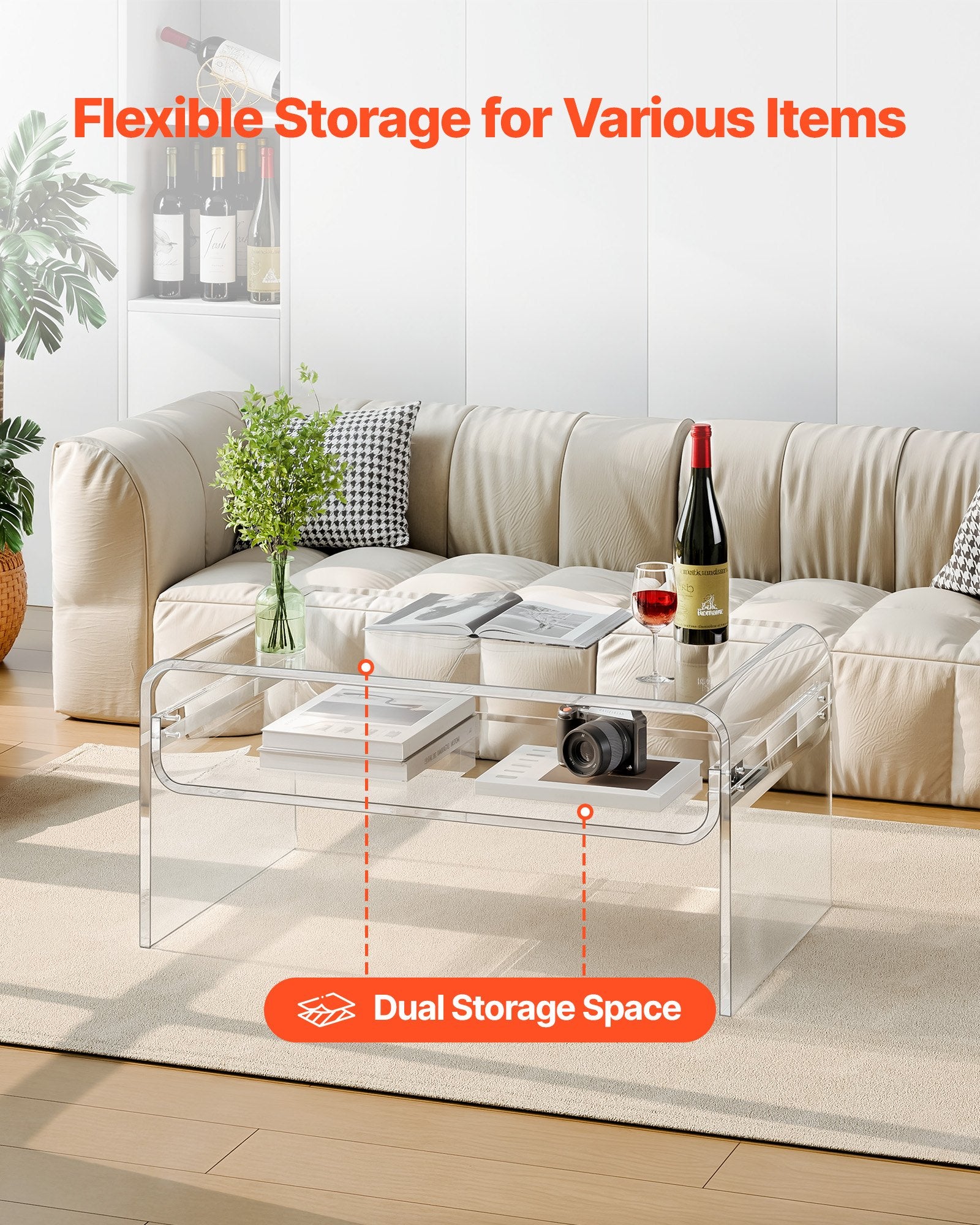 - Dual Storage Space: This acrylic coffee table features spacious 2-tier storage for laptops, books, documents, and décor. The transparent tabletop offers an unobstructed view, making it easy to find what you need—ideal as a coffee table or computer desk