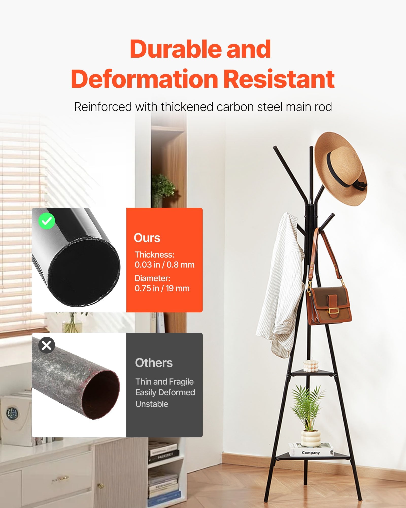 - Strong Load Capacity: Create a tidier home space with VEVOR coat rack. It features a stable triangular structure, 6 hooks, 2 storage shelves, and a thickened carbon steel main rod. Each hook holds up to 6.6 lbs (3 kg), with a total capacity of 22 lbs (10 kg), providing stable support for hanging coats, hats, bags, and more