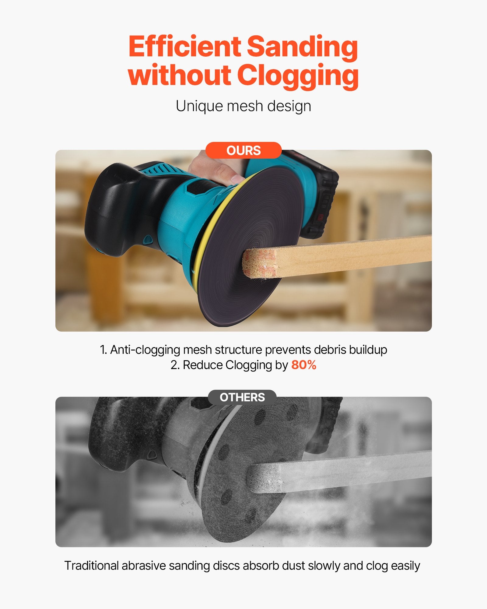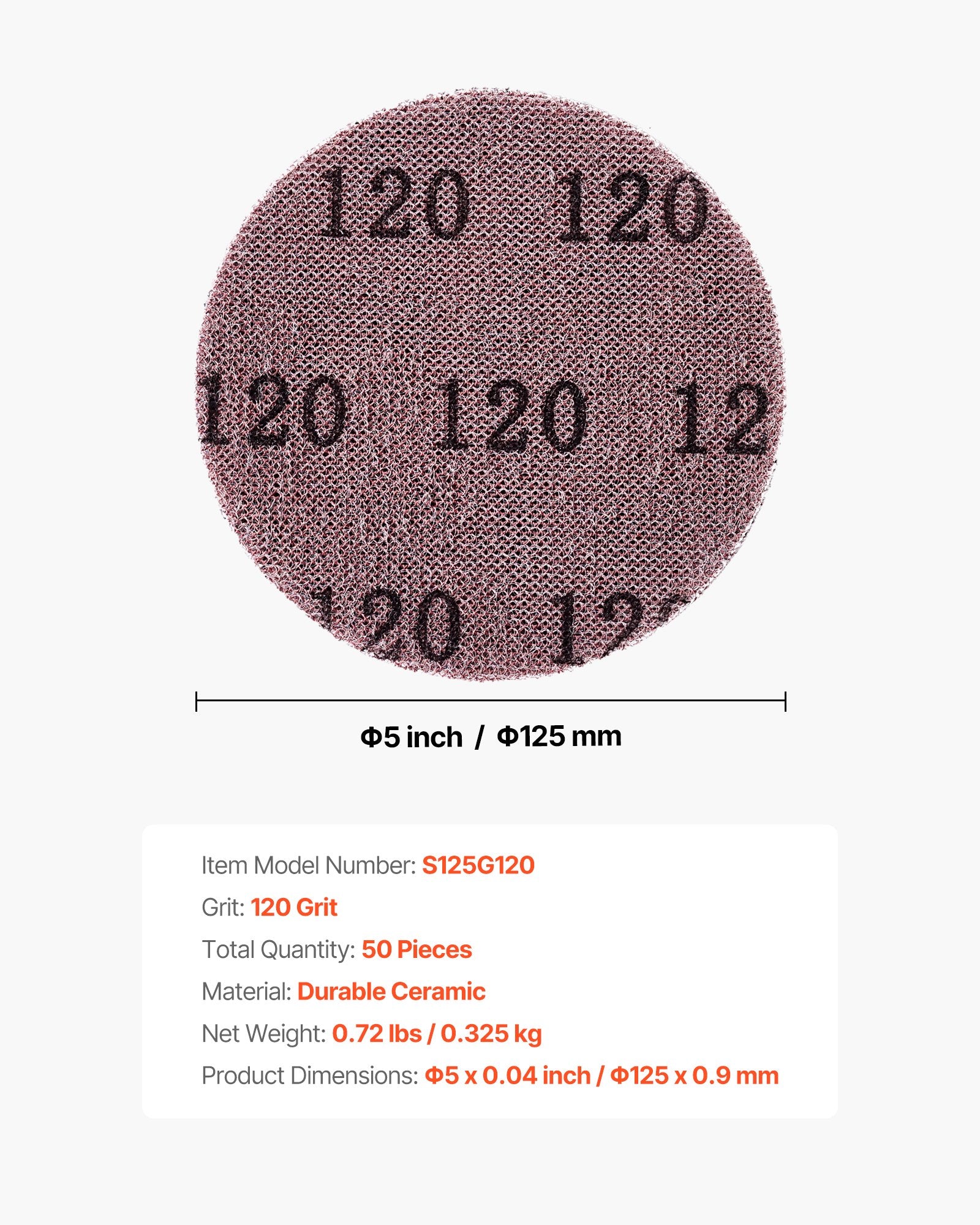 - Superior Dust Extraction: VEVOR 5-inch 50PCS 120 Grit mesh abrasive sanding discs adopt a unique anti-clogging mesh structure that quickly captures dust and prevents debris buildup. It effectively avoids clogging, ensures efficient sanding, and creates a virtually dust-free, cleaner workspace