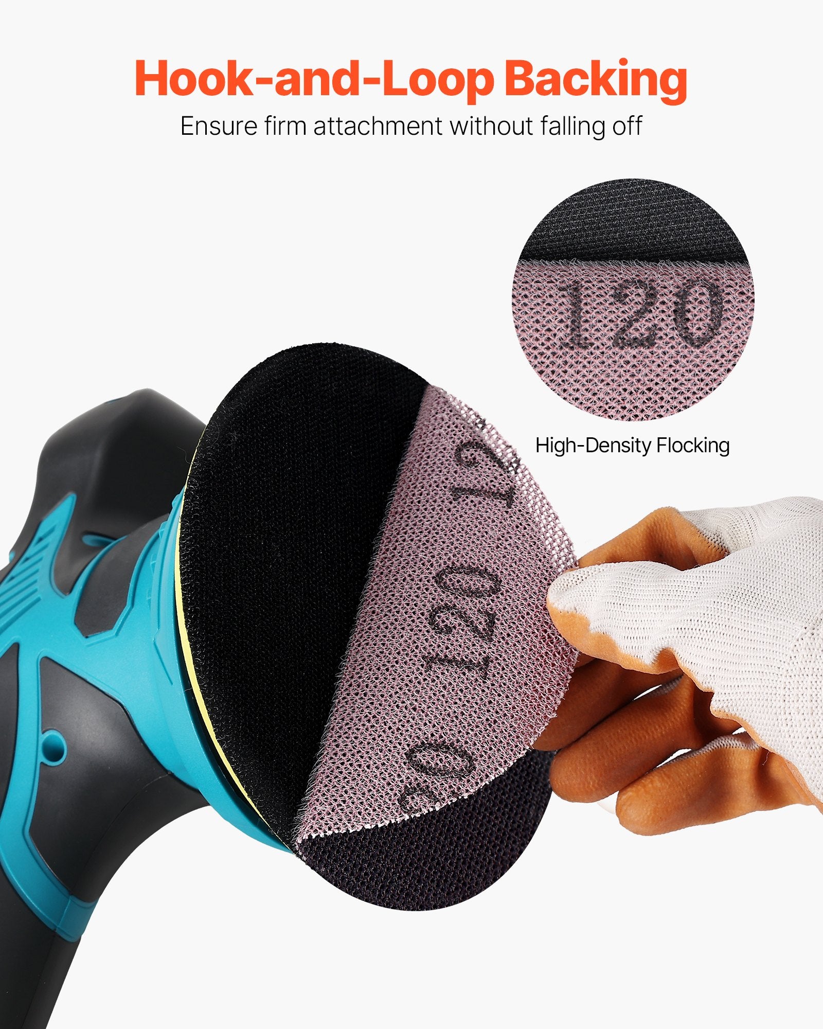 - Quick Change Hook-and-Loop Design: The hook-and-loop backing allows for quick and easy sanding disc replacement—just peel and stick, with no need to align holes. And the high-density flocking ensures a firm attachment and prevents the disc from slipping or falling off