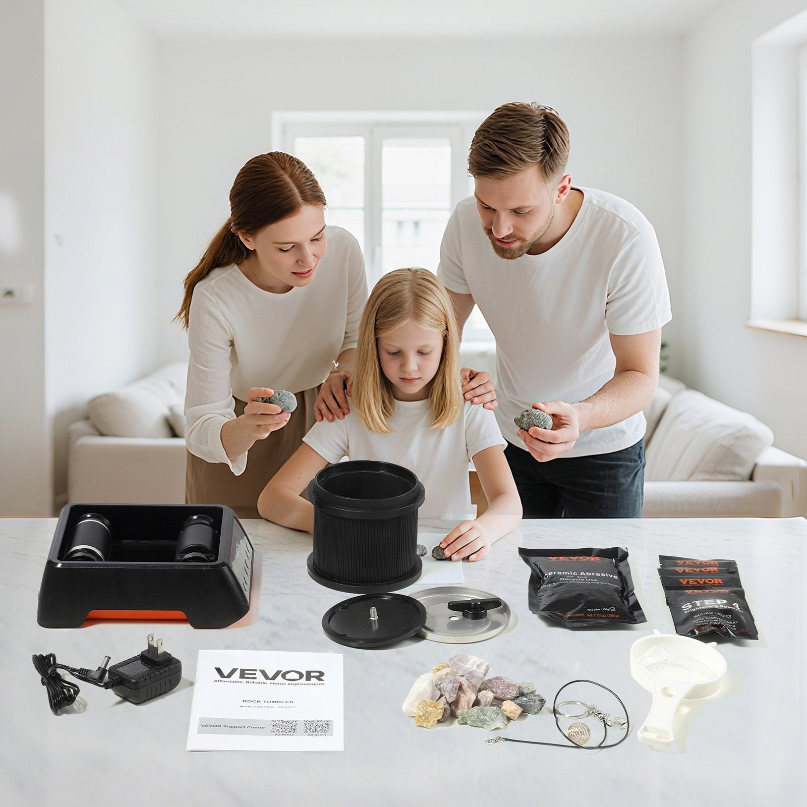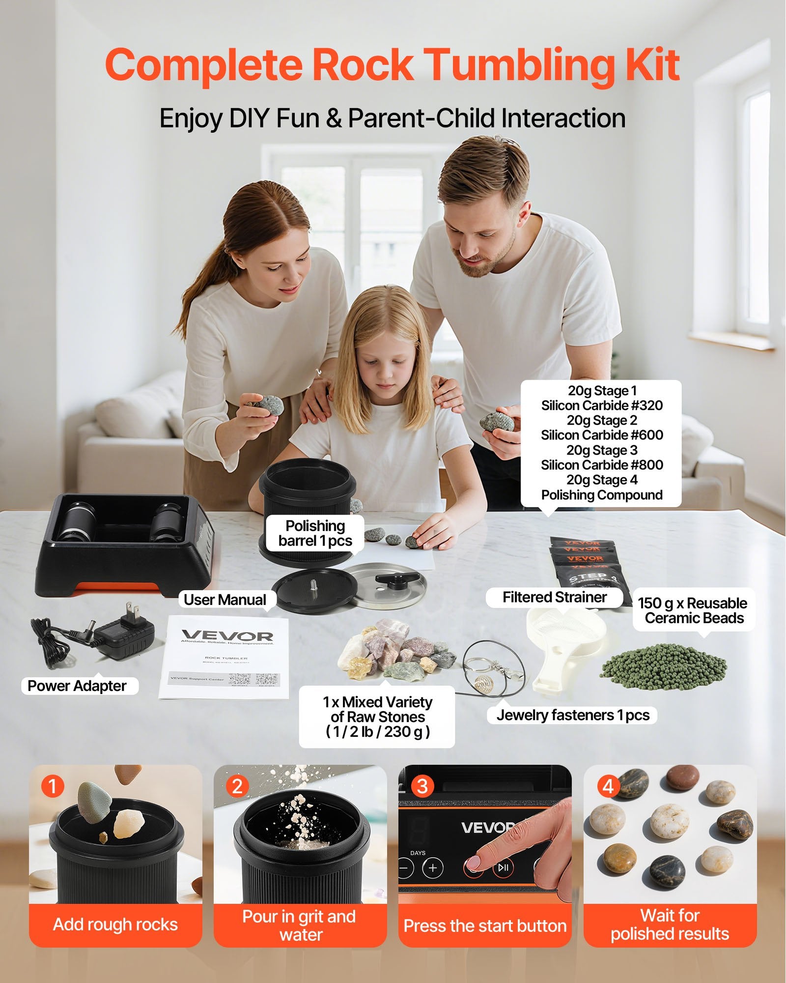 - Complete Accessory Set: VEVOR stone polisher kit provides all necessary accessories, including raw stones, ceramic grit, micro diamond powder, polishing enhancer, strainer, shaker ball, rings, cords, and adapters. Perfect for home crafting or family projects, it brings rough stones to shining gems easily