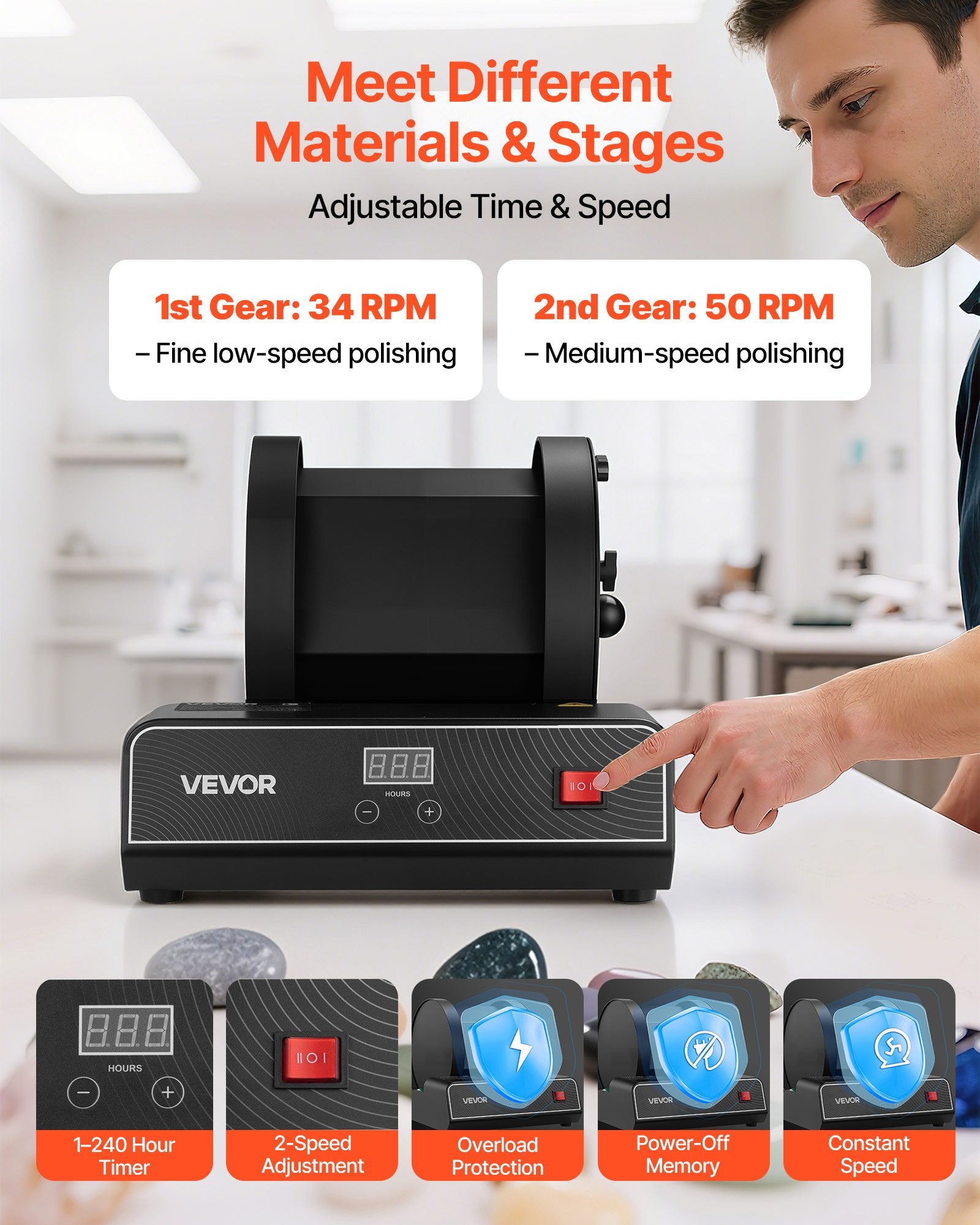 - Flexible Adjustment: Our stone tumbler includes a 1 to 240 hour timer and 2 speed levels ranging from 34 RPM to 50 RPM, easily meeting polishing needs for various materials and stages. Overload protection and power-off memory allow it to resume work after outages, while the constant-speed design ensures even and consistent polishing