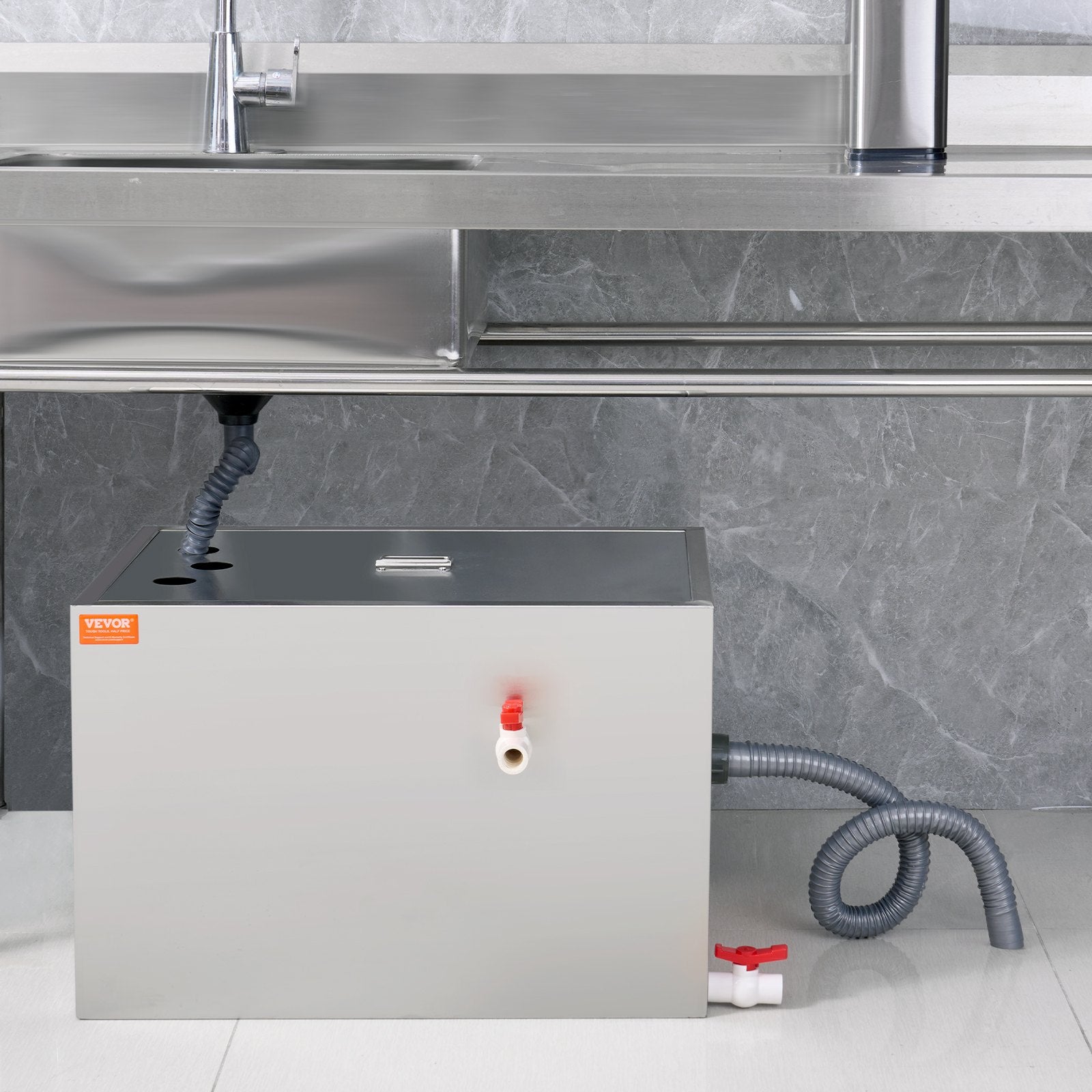 - Easy to Install: Fully assembled, this commercial grease interceptor requires no complex organization for installation. It features 3 openings at the top. Simply connect the pipes from the sink and dishwasher to the grease trap's inlet, and then directly drain from its outlet.