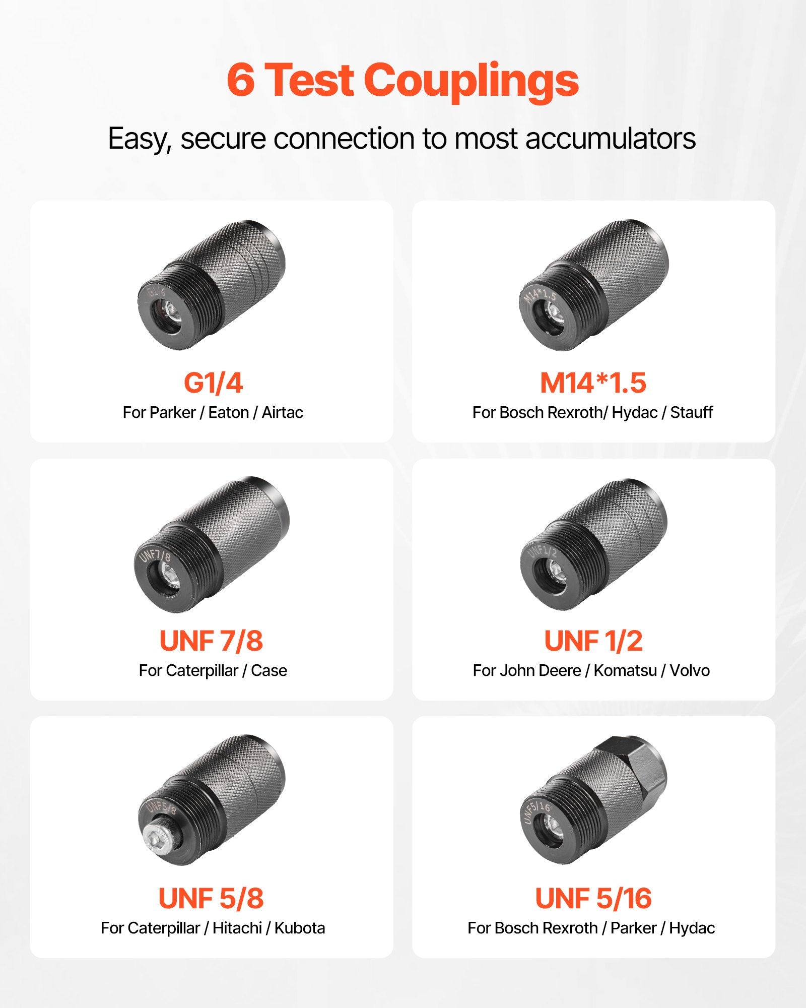- Nitrogen Filling & Testing: This hydraulic pressure test kit measures 1500/4000/6000 PSI. It includes three pressure gauges, six couplings, a hose, an adapter, and a nitrogen filling connector for accumulator nitrogen charging and pressure testing