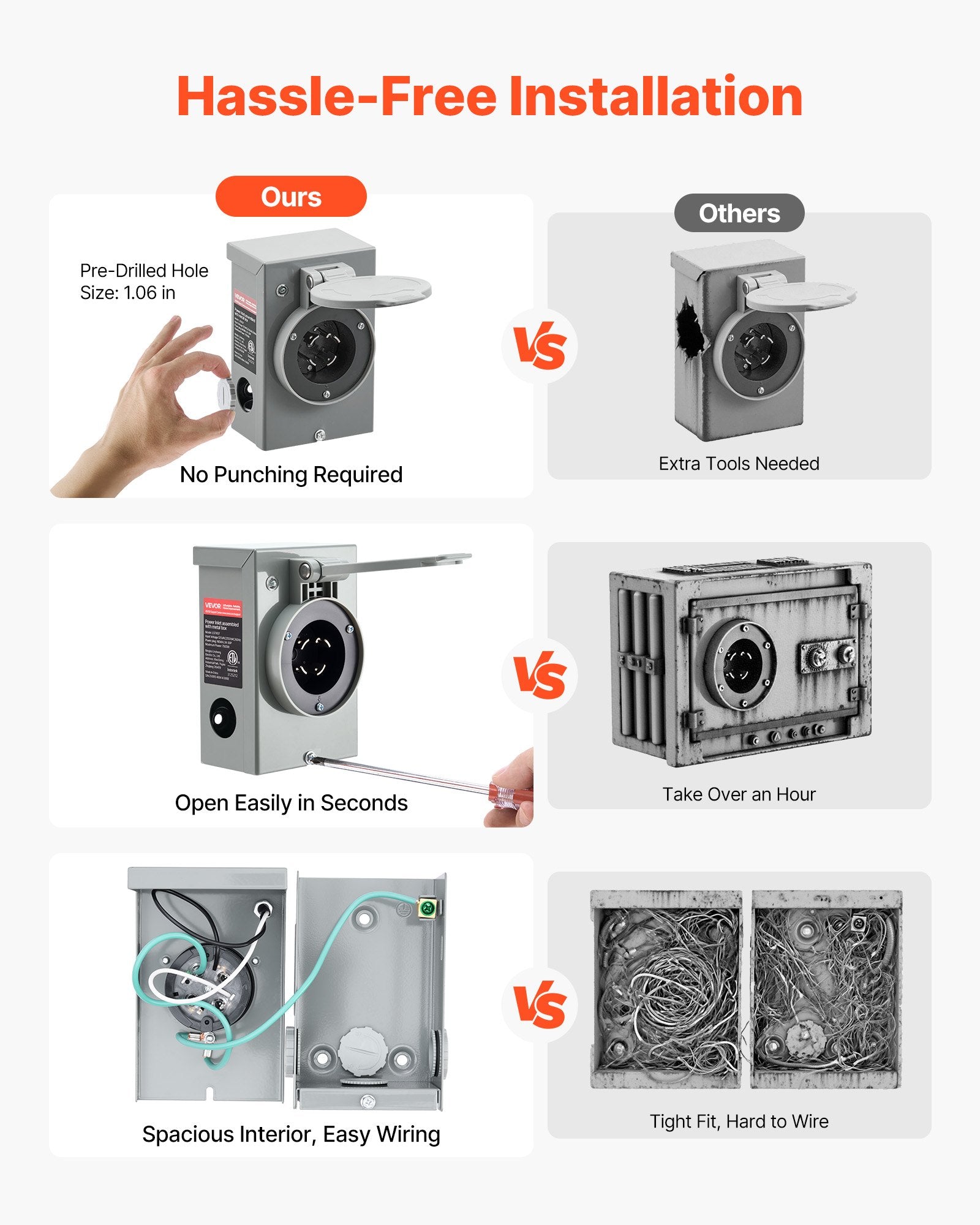 - Hassle-Free Installation: With pre-drilled holes and detachable knockouts, no drilling or extra tools are needed. With a spacious interior, our generator cord and power inlet box allow smooth wiring, saving you both time and effort