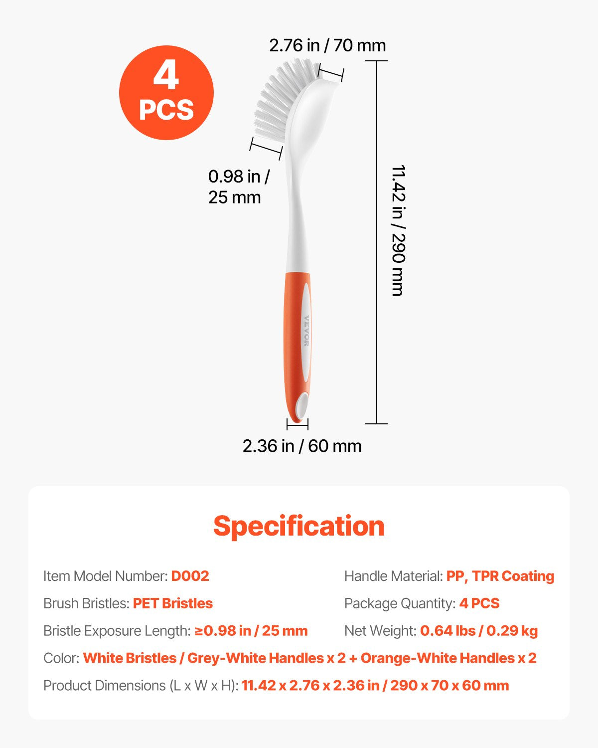 Dish Brush, 4 Pack Kitchen Scrub Brushes with PP Handle, Dish Cleaning Brushes with Curved Bristles, Ideal for Pots, Pans, Sink and Stove, 2 Gray + 2 Orange