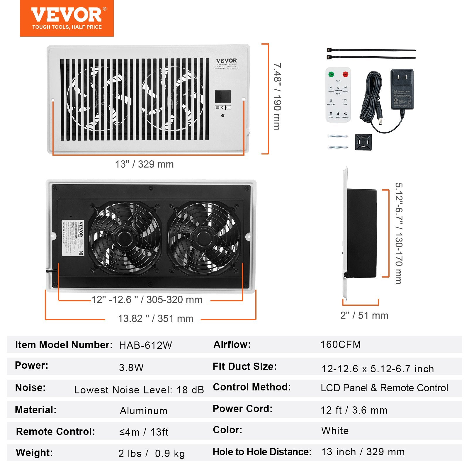 Register Booster Fan, Quiet Vent Booster Fan Fits 6 x 12 inch Holes, with Remote Control and Thermostat Control, Adjustable Speed for Heating Cooling Smart Vent, White