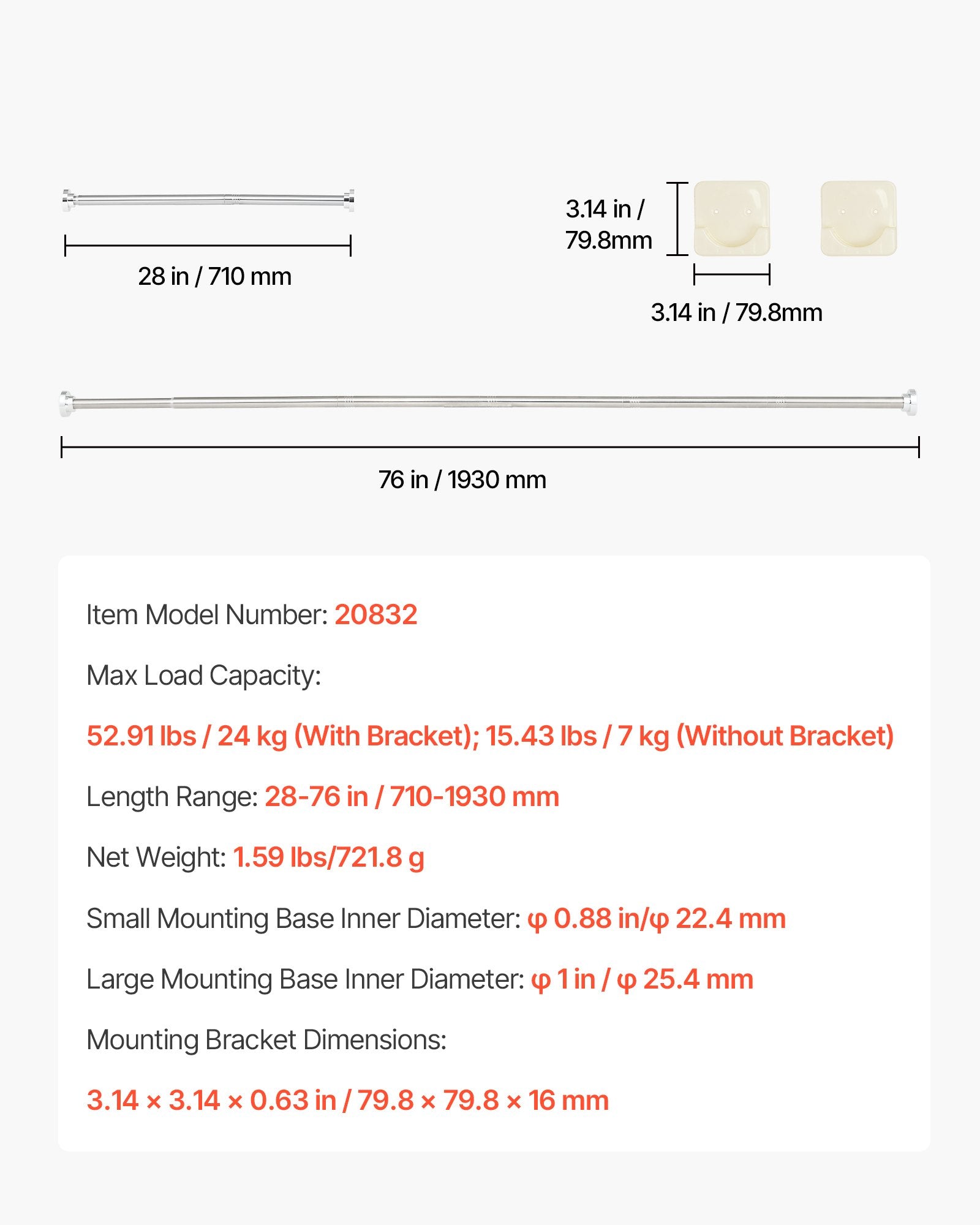 - Adjustable Length: The middle part of the tension shower rod can be connected with multiple extension tubes with an adjustable length (28-76 in). The multi-section screw connection can evenly bear the weight and reduce the risk of breakage