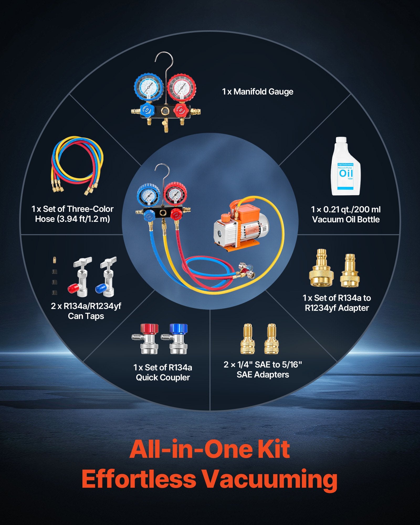 - All-in-One Complete Kit: Comes with a vacuum pump, manifold gauge set, three-color hose, R134a to R1234yf adapter, R134a quick coupler, R410a 1/4" SAE to 5/16" SAE adapter, R134a & R1234yf can taps, 0.21 qt.(200 ml) vacuum oil bottle, and a portable carrying bag