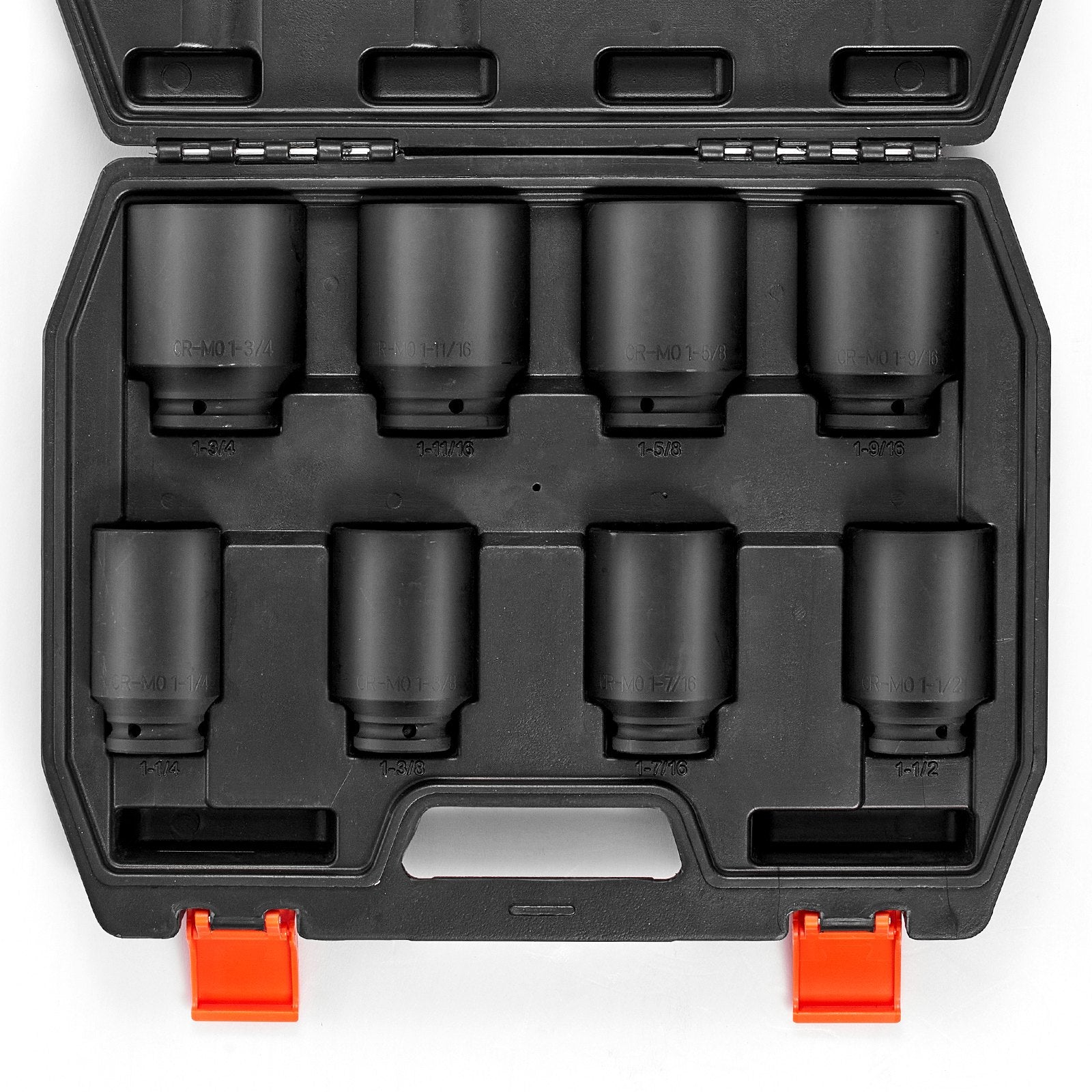 - 3/4 Inch Drive Axle Nut Socket Set: This SAE 8-piece axle nut impact socket set includes sizes 1", 1-1/16", 1-1/8", 1-1/4",1-5/16",1-3/8",1-7/16" and 1-1/2". It is perfect for efficiently tightening axle nuts and bolts.
