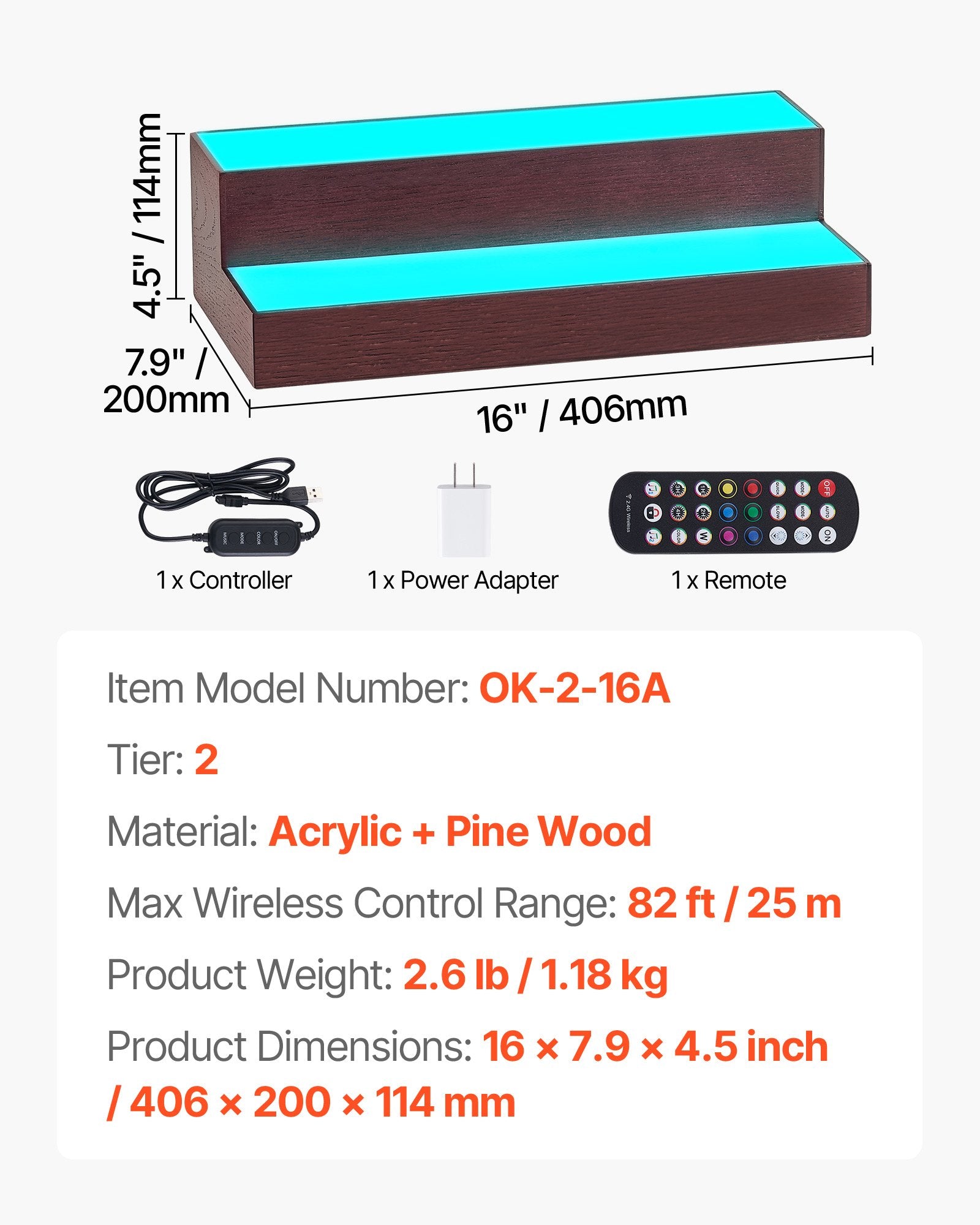 LED Lighted Liquor Bottle Display, 2-Tier 16 Inch Whiskey Rack, Supports USB, Illuminated Home Bar Shelf with RF Remote & App Control, 7 Static Colors, Acrylic+ Wood Lighted Shelf for 8 Bottles