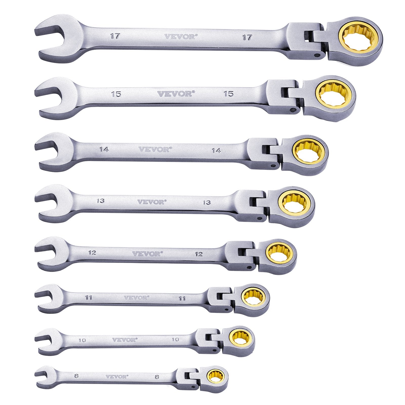 Flex-Head Ratcheting Wrench Set, 8-piece Combination Wrench Set with Roll-up Pouch, Cr-V Steel Flexible Ratcheting Wrench Set Metric 8 mm to 17 mm, Ideal for General Household, Auto Repairs