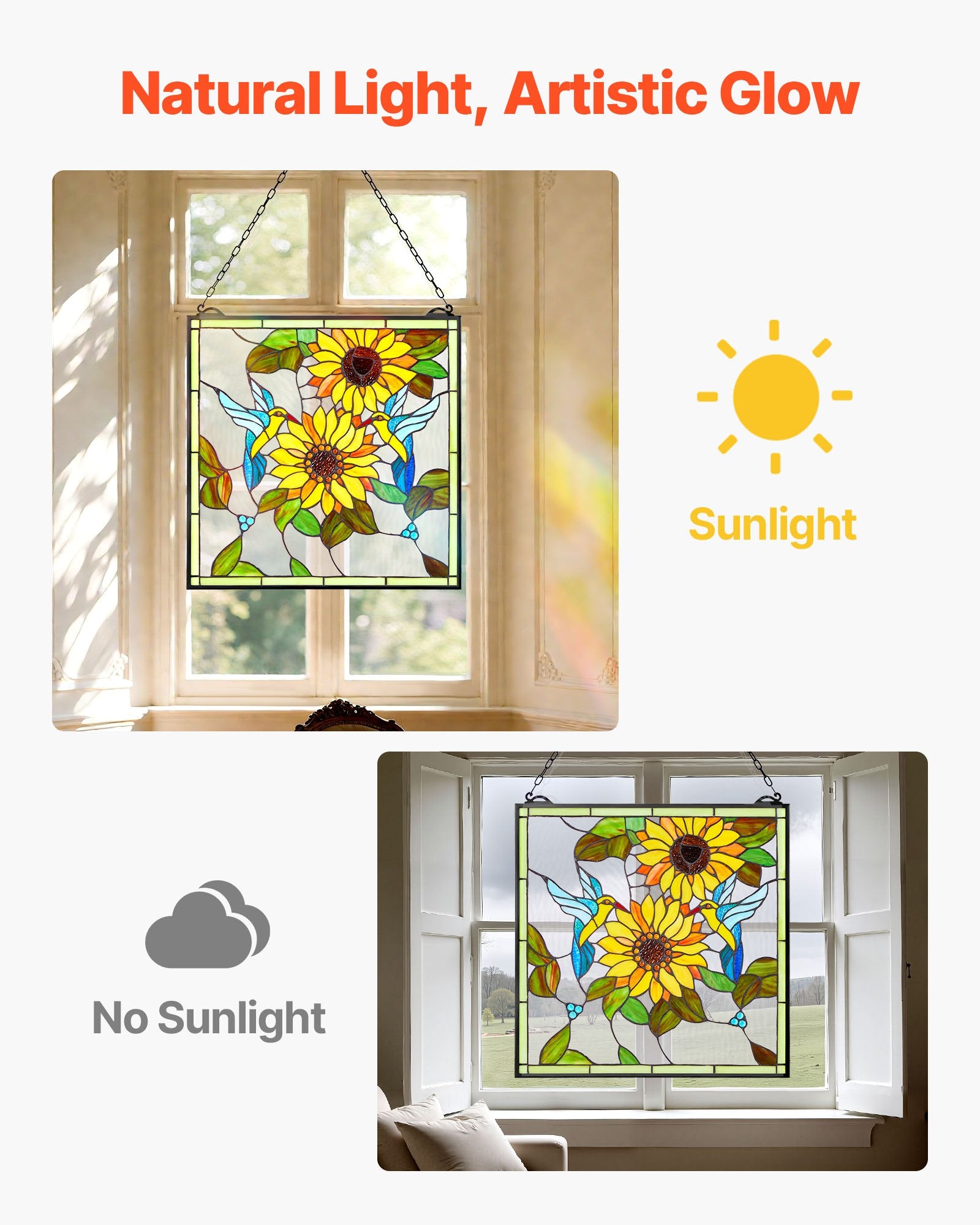 - Ready to Hang: Our stained glass panel comes with a pre-attached iron chain and hooks—no extra hardware required. It is easy to hang and install on any wall surface