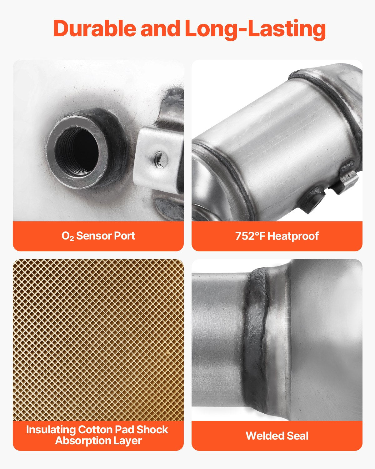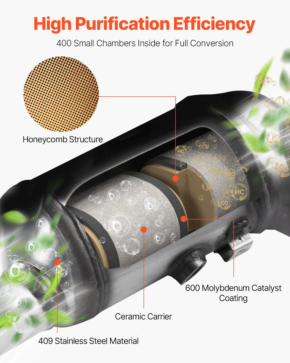 - Stainless Steel Construction: The high flow catalytic converter is constructed with heavy-duty T409 stainless steel that is heat-proof and rustproof. It is designed to withstand high temperatures and pressure within the exhaust system, ensuring long-lasting durability without worries of bending or melting