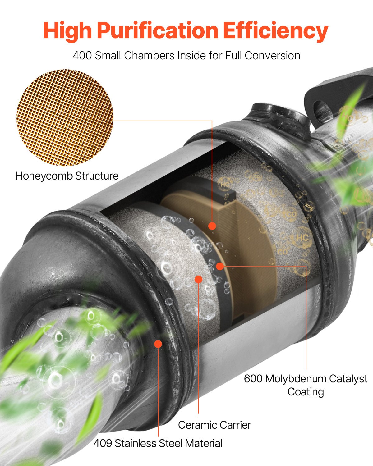 - Stainless Steel Construction: The high flow catalytic converter is constructed with heavy-duty T409 stainless steel that is heat-proof and rustproof. It is designed to withstand high temperatures and pressure within the exhaust system, ensuring long-lasting durability without worries of bending or melting