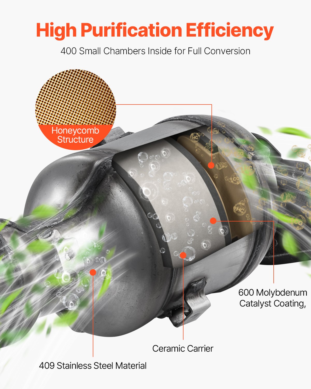 - Stainless Steel Construction: The high flow catalytic converter is constructed with heavy-duty T409 stainless steel that is heat-proof and rustproof. It is designed to withstand high temperatures and pressure within the exhaust system, ensuring long-lasting durability without worries of bending or melting