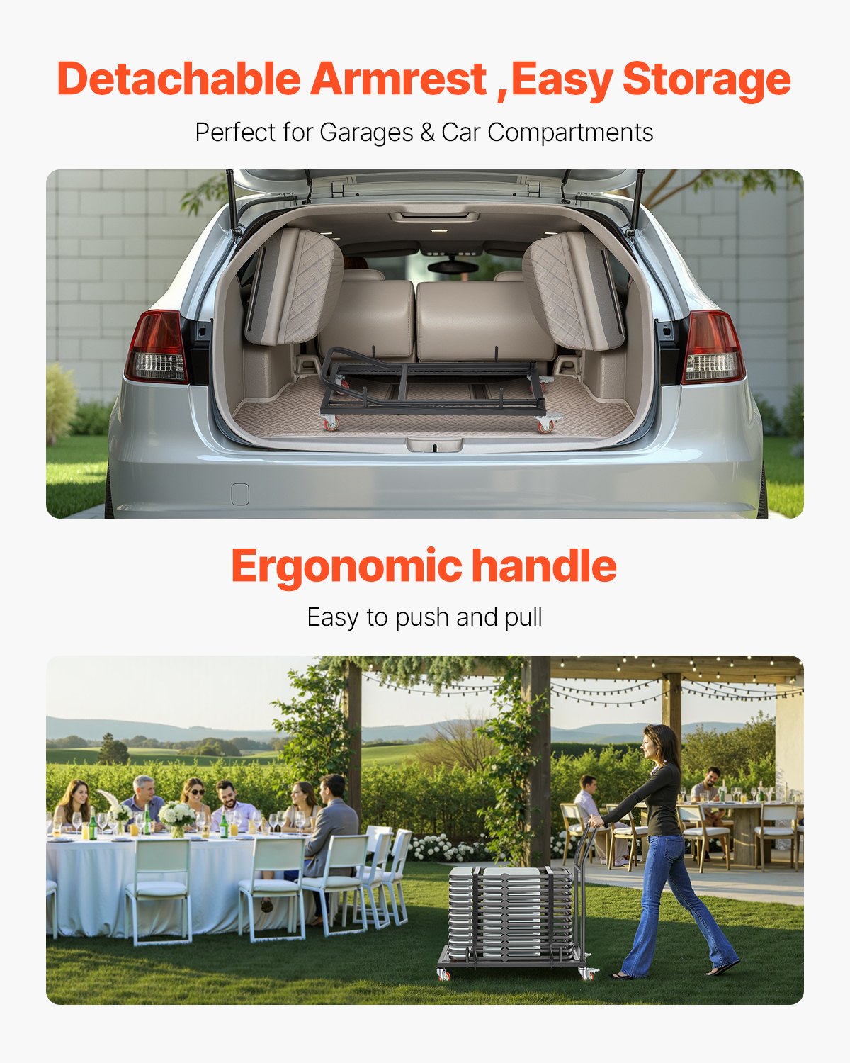 - Product Dimensions: With a length of 42.5 inches, a width of 20 inches and a height of 42.9 inches, our folding chair cart has a maximum load capacity of 300 lbs. This allows you to store up to 25 chairs (Note: Does not include folding chairs.), providing flexibility and space-saving comfort.
