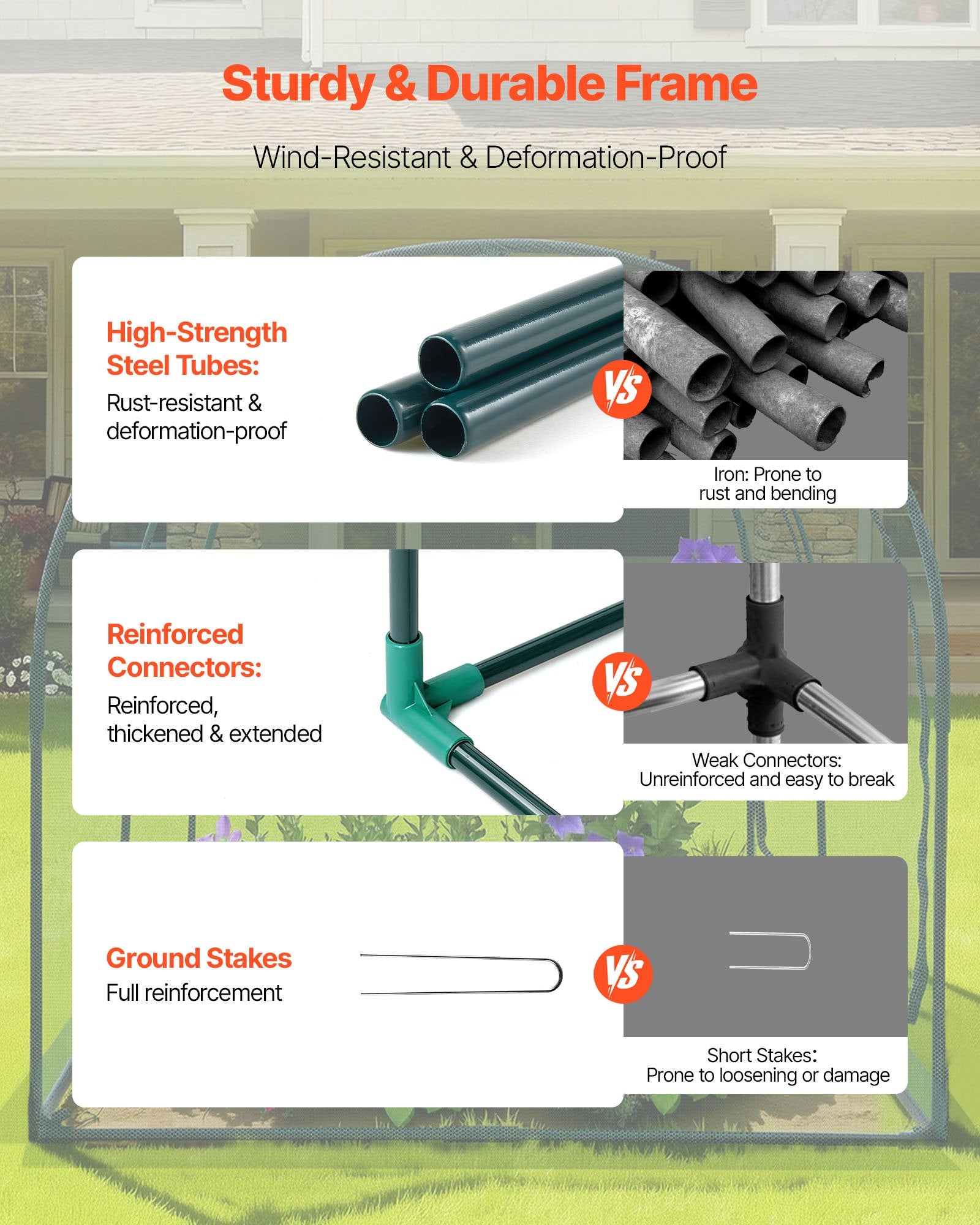 - Stable & Wind-Resistant: Made of powder-coated steel tubes, our plant protection tent is rust- and corrosion-resistant. Reinforced plastic joints fit snugly with the main frame for added stability, while U-shaped ground stakes provide wind resistance