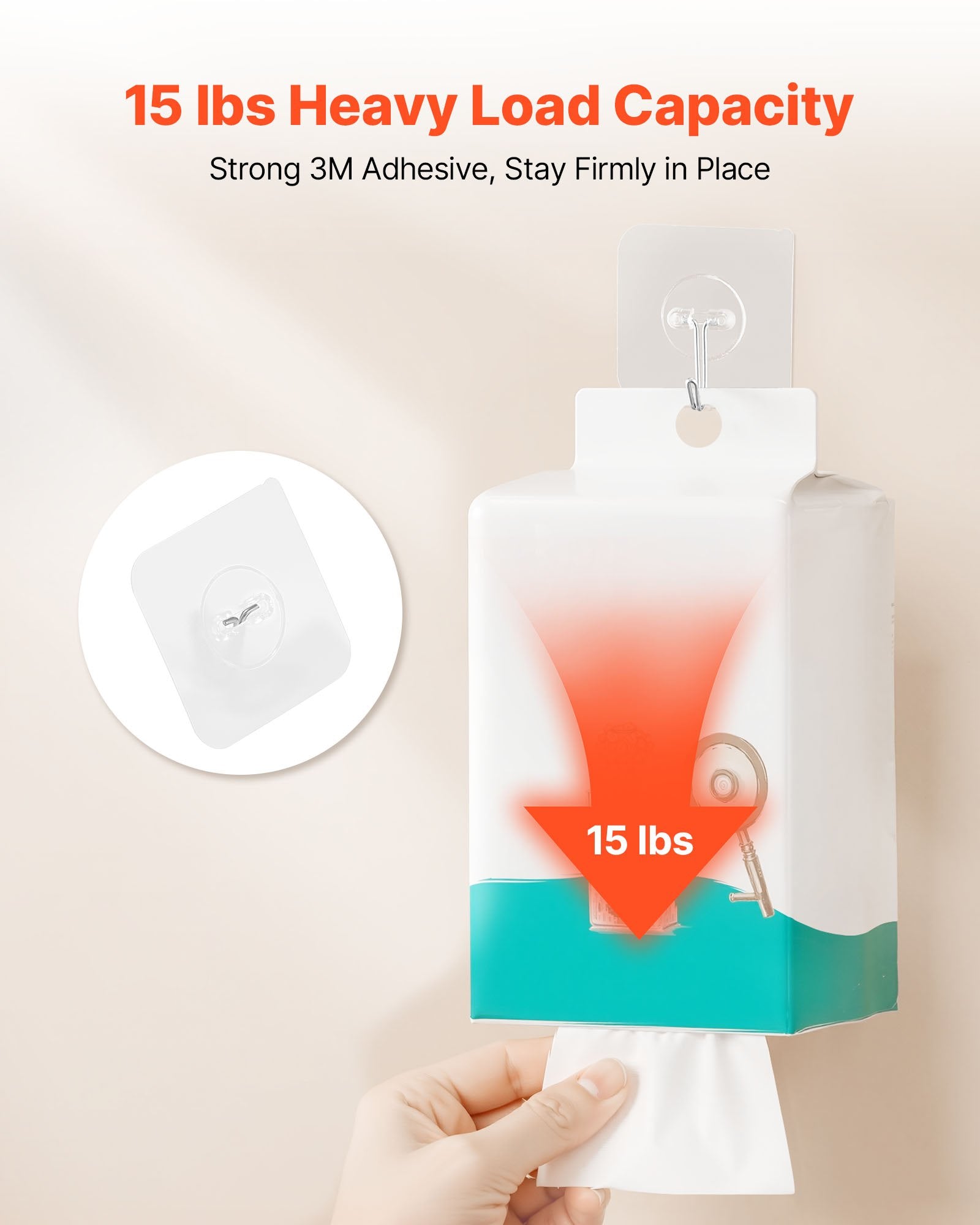 - 15 lbs Load Capacity: The back of this adhesive hook uses 3M adhesive with strong stickiness, supporting up to 15 lbs. It securely holds kitchen tools, towels, keys, and clothes. Tip: The recommended load is 11 lbs. Not for fragile or valuable items.