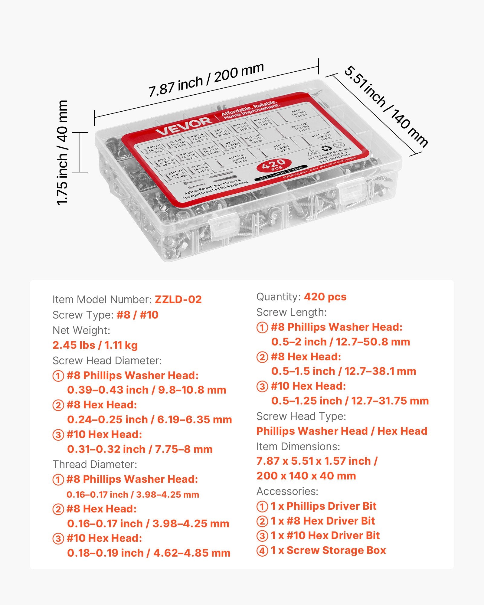 - Well-Stocked Assortment: This stainless screw assortment includes 420 screws in 18 carefully planned sizes, covering common #8 and #10 specifications with both Phillips washer and hex head types. Extra quantities are provided for frequently used sizes. Whether for bulk use in large projects or occasional repairs, it ensures reliable supply without material shortages