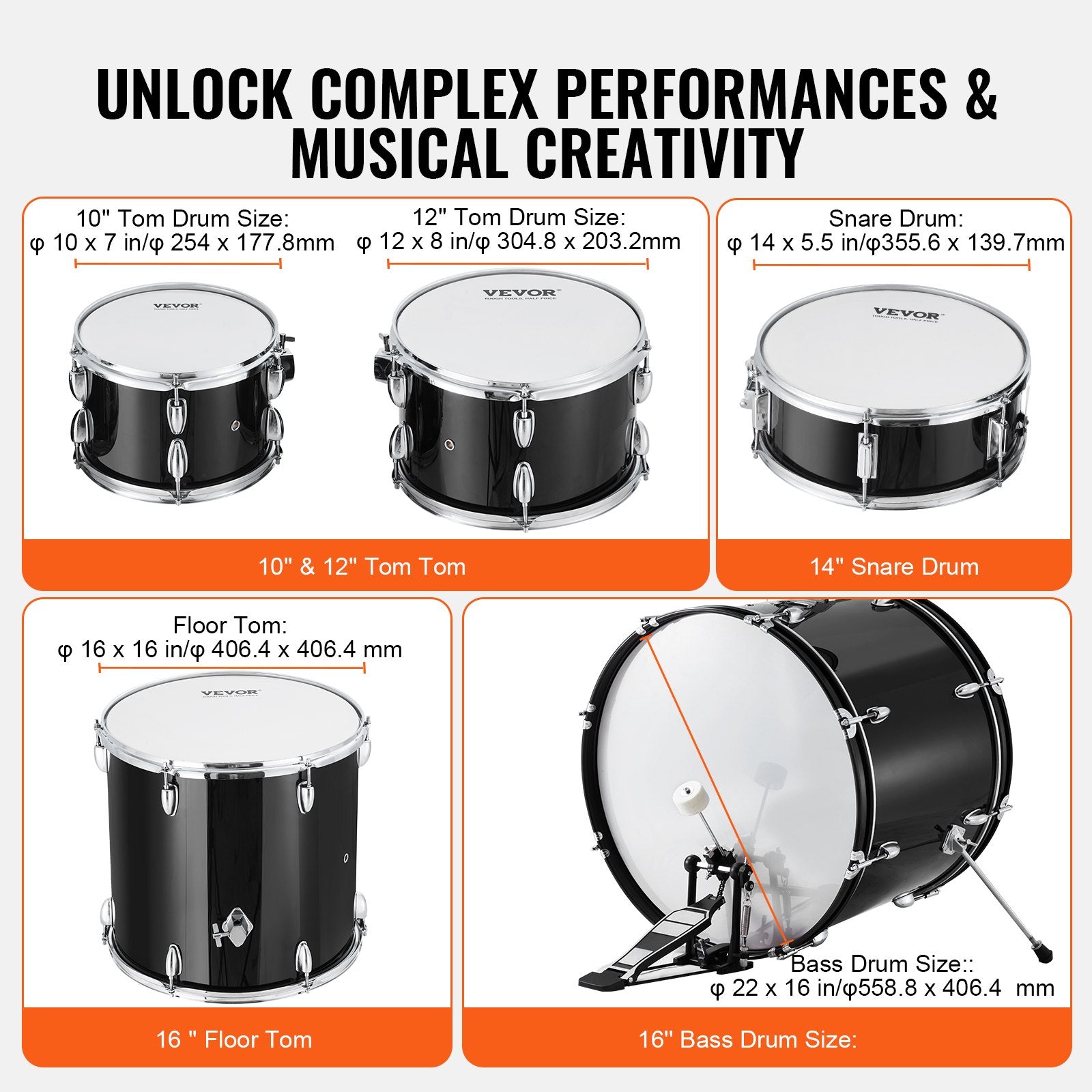 5-Piece Drum Set from Beginner to Pro: Embark on a musical journey from beginner to pro with our adult drum set! It includes a 22" bass drum with pedal, 14" snare drum, 10" & 12" tom tom and 16" floor tom, along with a 10" suspended cymbal and an 8" hi-hat cymbal with stand, allowing you to explore complex rhythms and unleash your creativity.