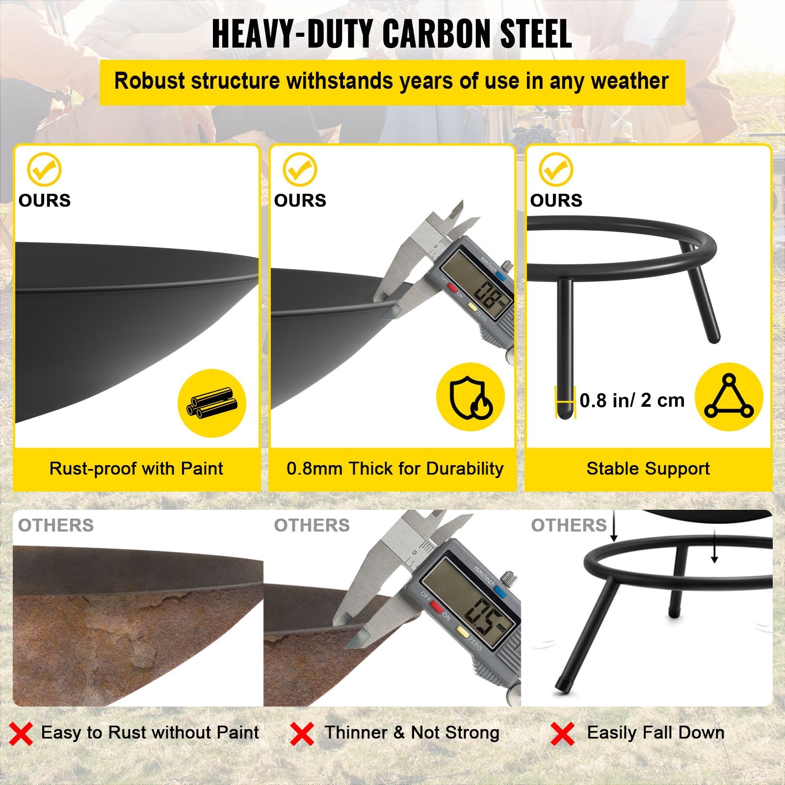 Durable Carbon Steel: The outdoor fire bowl made of high-strength carbon steel is painted black for heat-resistant and rust-resistant to ensure long-lasting quality and functionality in all weather conditions. The base supports a stable stand when in use. In addition, the smooth painted surface can be easily maintained with a wet cloth.