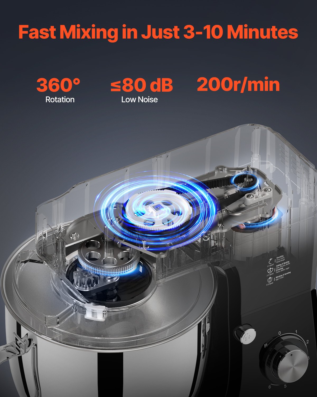 High-performance mixing: Our electric food mixer comes with a powerful motor and a worm gear for fast and smooth mixing. Choose from 6 adjustable speeds and a pulse setting to get the results you want every time. Use speeds 1-3 for dough, 2-4 for fillings, and 5-6 for whipping cream. Note: Always stop the machine before changing speeds.