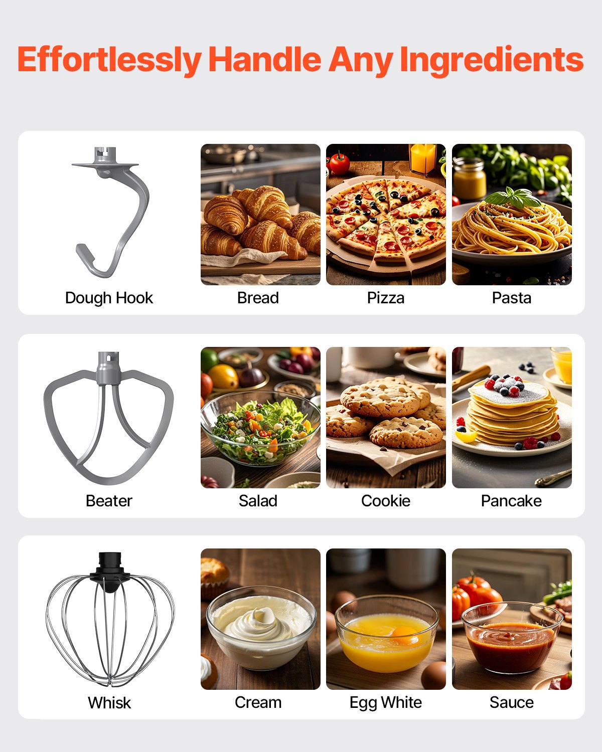 Complete mixing solution: Ready to tackle anything in the kitchen! Our stand mixer has 3 professional mixing attachments: a dough hook for effortlessly kneading pizza or other heavy dough, a flat beater for whipping up mashed potatoes, cake batter, or frosting, and a whisk for creating light mixtures like fluffy whipped cream or egg whites.