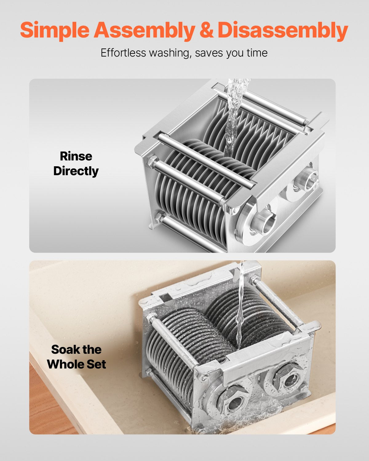 Easy Disassembly and Cleaning: Made of high-quality stainless steel, our commercial meat slicer knife set resists rust and is easy to clean. Simply rinse with a water gun or submerge the entire machine for a complete wash. It's all about convenience and efficiency!