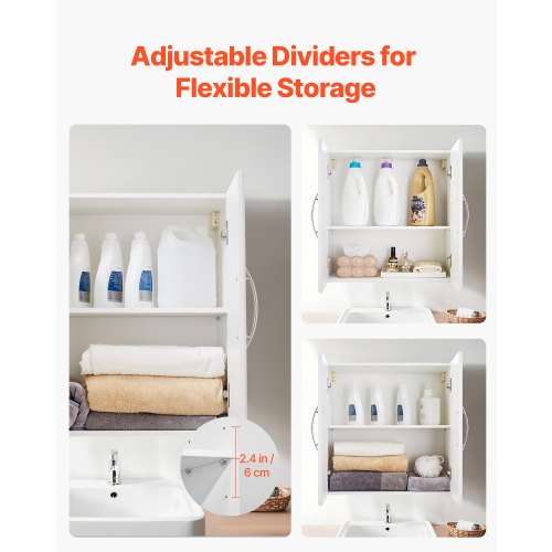 Spacious and Adjustable: Our laundry room wall cabinet features a hidden, dust-free storage space with a hinged door. The 3-tier adjustable shelving system allows you to customize the storage space based on the size of items like detergent and towels, maximizing the cabinet's capacity for even greater storage.