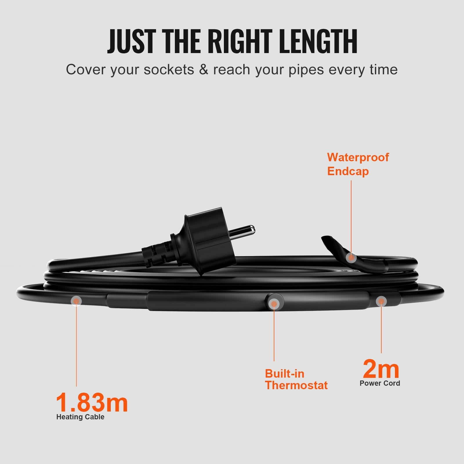 No more frozen pipes: Protect your water pipes from freezing with our 1.83m 16.4W/m self-regulating heating cable. It automatically adjusts output to the ambient temperature, raising the temperature by 85℉ in just 5 minutes, providing fast and reliable protection against the cold.