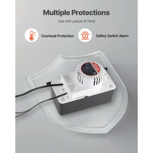 Safety comes first: The condensate pump is equipped with a safety switch to shut down the air conditioner condenser or connect to an alarm. If the pump fails, it will alarm to prevent the water tank from overflowing. The motor also has thermal overload protection to prevent it from burning out when overheating.