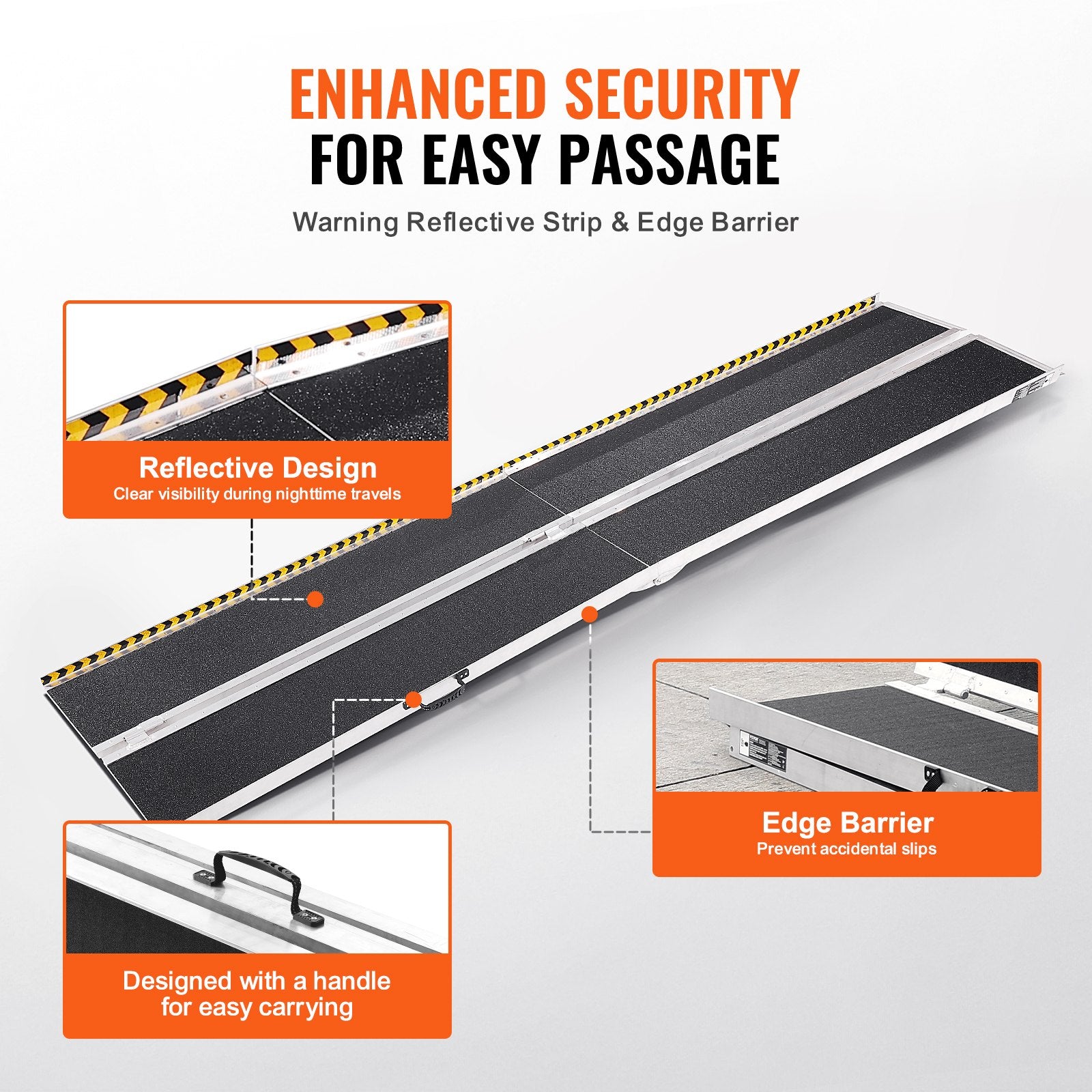 Safety First: Equipped with reflective strip and edge barrier, our portable wheelchair ramp prioritizes safety. These features improve visibility in low light and prevent accidental slips or collisions, ensuring a smooth and safe journey every time.