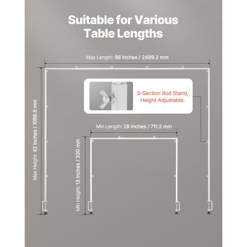 Adjustable Multi-Size Design: The table's balloon arch frame offers 3 adjustable heights (13 inches, 28 inches, 42 inches), with lengths between 28 inches (711.2 mm) and 98 inches (2489.2 mm), and fits 4FT, 6FT and 8FT tables. The clamp can securely hold tables up to 3 inches thick and provides precise support for various activities.