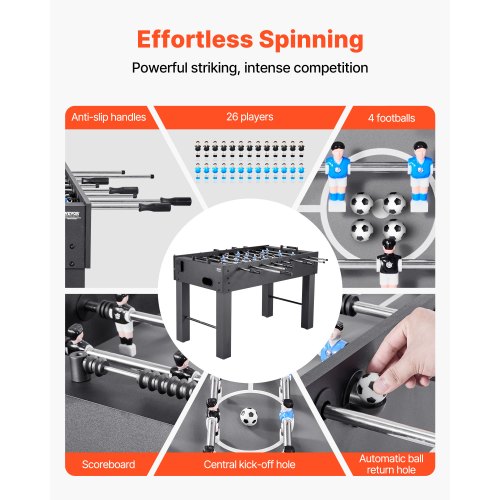Robust och hållbart: Det 55-tums fotbollsbordet är tillverkat av slitstark fiberplatta med medeldensitet. Det har plats för 26 spelare och 4 fotbollar. Stavarna är raka och släta, vilket säkerställer kraftfulla slag utan att böjas eller rosta.