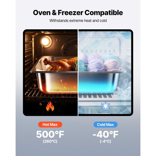 Rostfritt stål av kommersiell kvalitet: Vår hotellpanna i rostfritt stål är tillverkad av rostfritt stål av kommersiell kvalitet 22-gauge SS201 för långvarig hållbarhet och utmärkt rostbeständighet. Den är idealisk för att förvara både varm och kall mat och tål temperaturer från -40℉ till 500℉ (-4℃ till 260℃). Lämplig för diskmaskiner, kylskåp, frysar med mera som tål höga temperaturer.