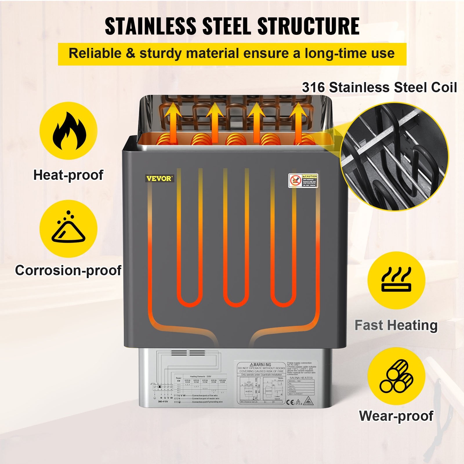 430 rostfritt stål: Tillverkad av utmärkt 430 rostfritt stålskal, vår bastuaggregat är korrosionsbeständig och hållbar. Tillverkad med en energibesparande värmeslinga i 316 rostfritt stål, är värmaren snabb att värma upp. Dessutom är ytan behandlad med en pläteringsyta för att isolera luften och kontakten av rostfritt stål för att uppnå den icke-oxiderande effekten.
