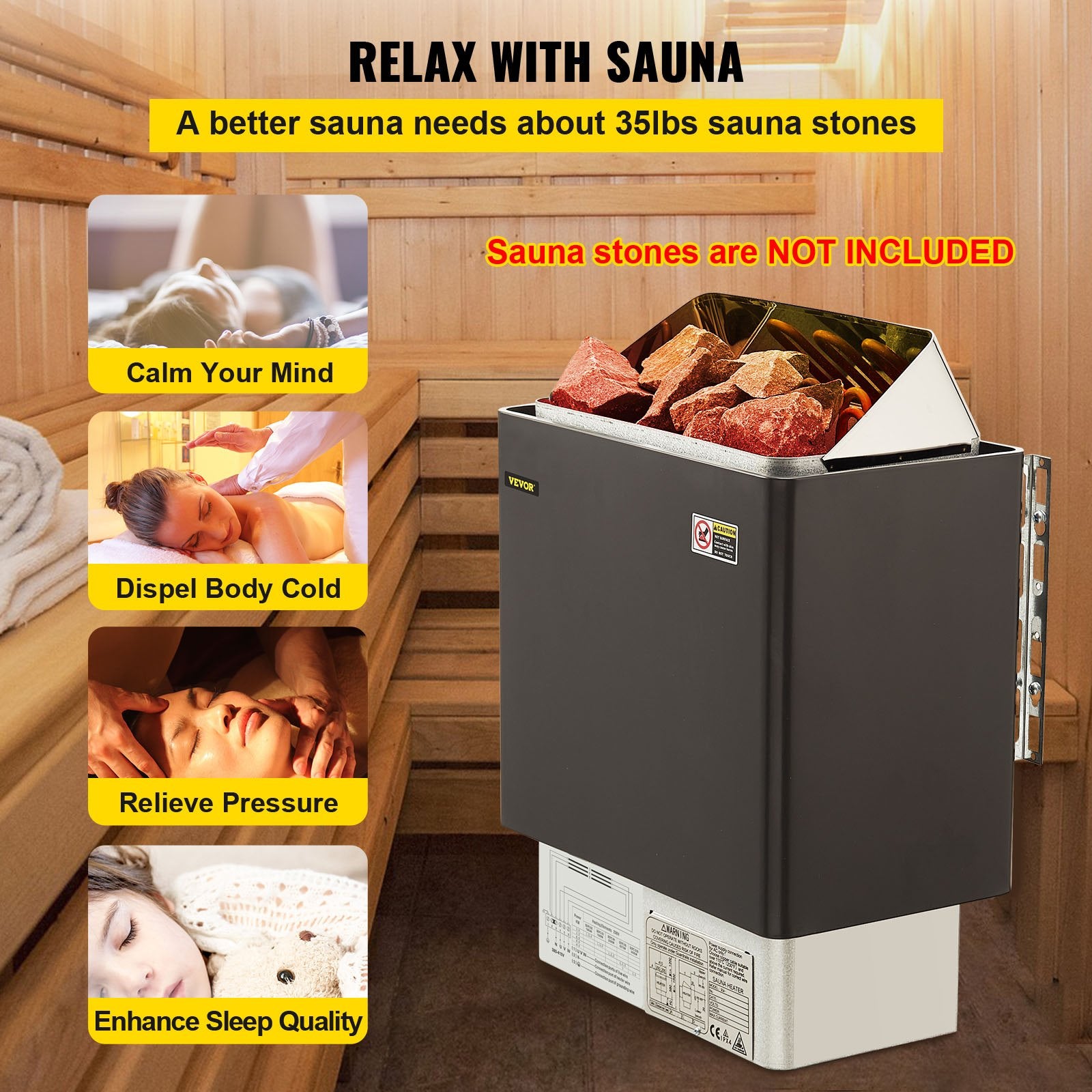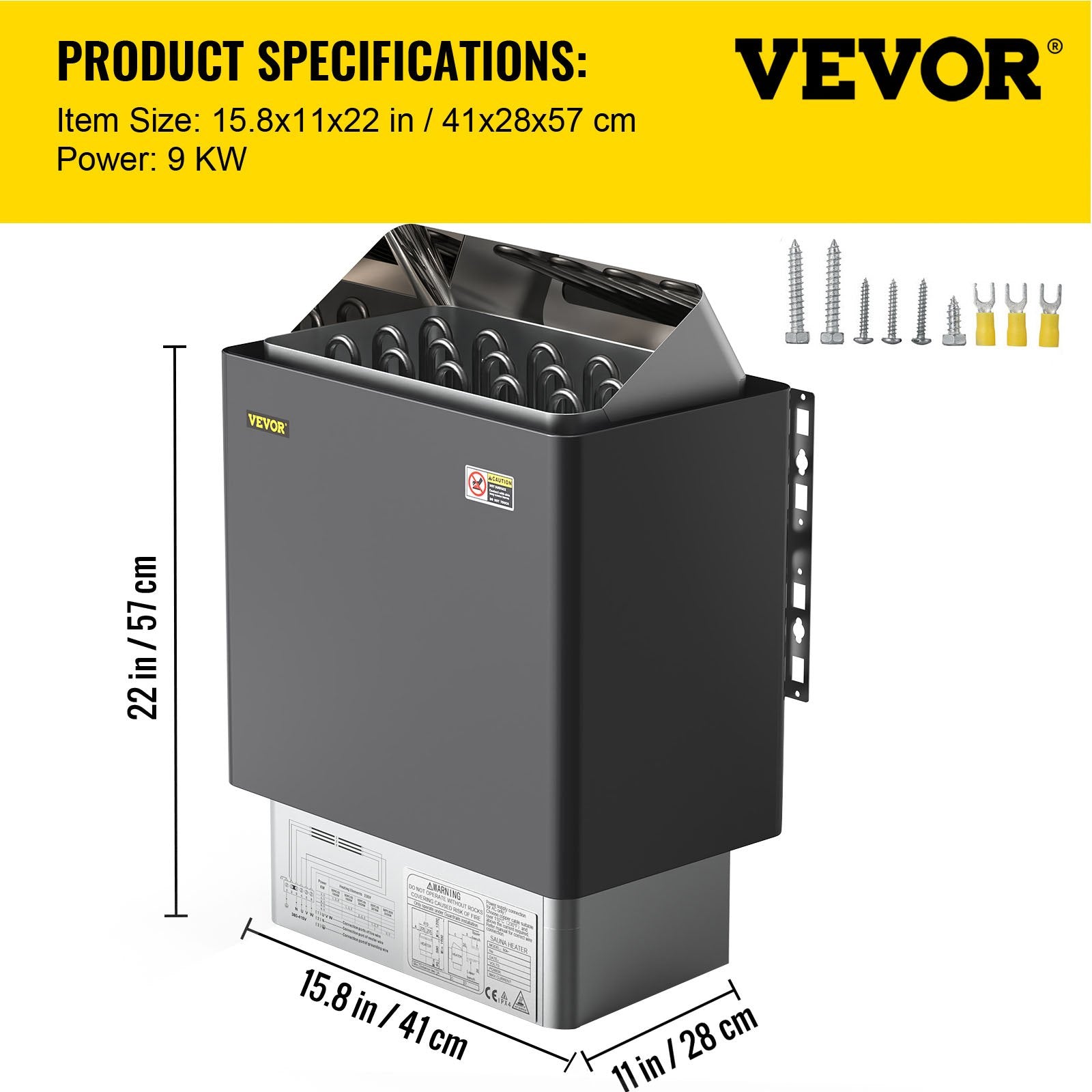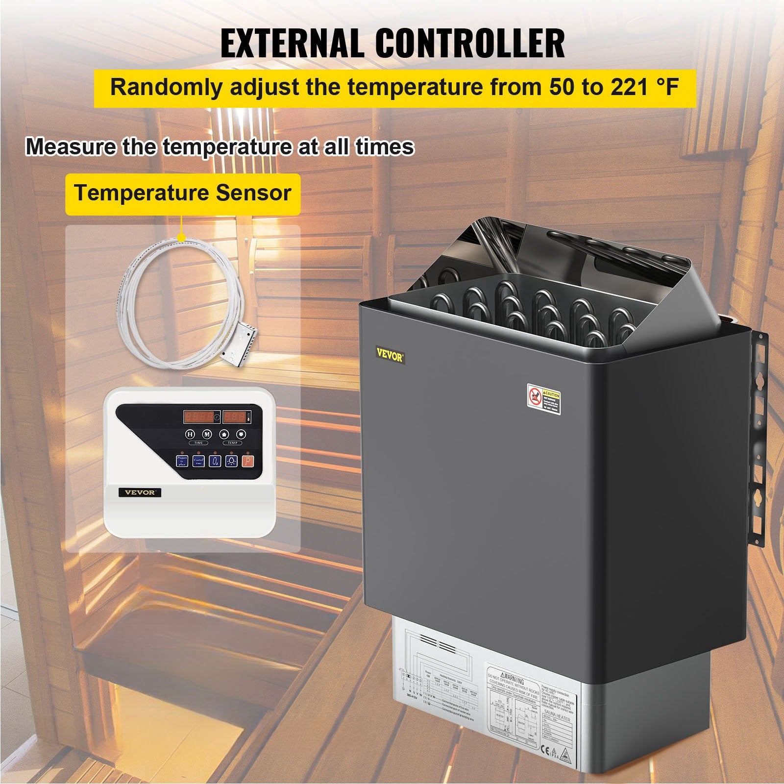 Premium bastuvärmare: Effekt: 9KW; Arbetsspänning: 380-415V; Ström: 13,5A; Lämpligt basturum: 317-459 kubikfot (9-13 m³), 6,2 fot (190 cm) höjd; Bastustenar behöver: 16 kg (35 lbs) ; Temperaturområde: 50-221 ℉ (10-105 ℃). Obs: Bastustenar INGÅR INTE.