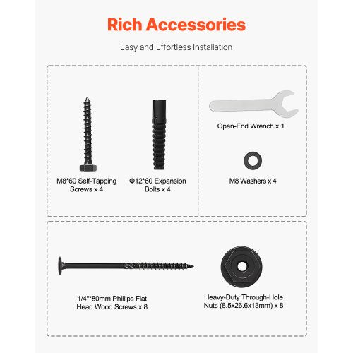 Kompletta tillbehör: Vårt stolpankare inkluderar M8*60 självgängande skruvar, φ12*60 expansionsskruvar, M8 brickor, 1/4" x 80 träskruvar med krysspår och platt huvud, kraftiga muttrar för genomgående hål (8,5 x 26,6 x 13 mm), 13 u-nyckel, fyrkantiga stora brickor och stödfästen, vilket gör installationen enkel och smidig.