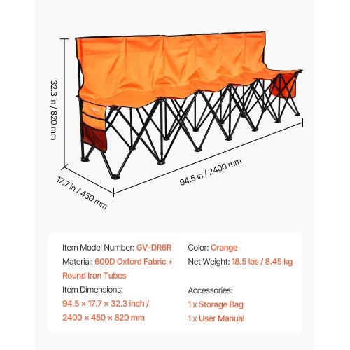 Bärbar Hopfällbar Bänk, 6-sits Hopfällbar Fotbollsbänk med Sidofickor och Bärväska, Lätt Sidosittplats med Ryggstöd för Fotboll, Baseboll, Camping, Utomhusevenemang, Orange | EU