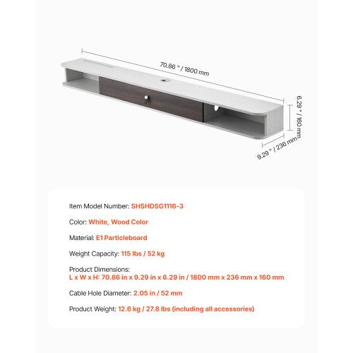 Robust och hållbart: Detta flytande TV-stativ är tillverkat av spånskiva av E1-kvalitet med en melaminfinish och är byggt för att hålla. Det klarar en vikt på upp till 50 kg, så det är perfekt för din TV och andra enheter. Tillräckligt hållbart för att hålla, det kommer att hålla din installation snygg i åratal.