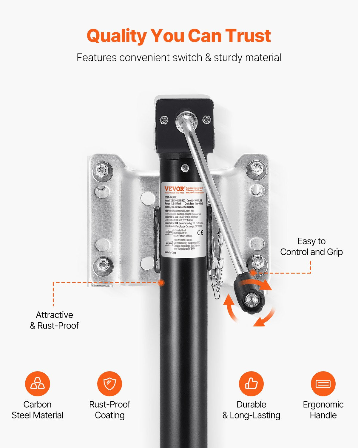 Redo för alla jobb: Oavsett om du lyfter en husbilssläp, hästsläp eller nyttovagn, kan denna bult på trailerdomkraften hantera det. Inget behov av kraft – veva bara upp den så är du redo att lyfta och sänka med lätthet och självförtroende.