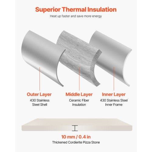 Hållbar konstruktion: Denna pizzaugn tål utomhusförhållanden och frekvent användning. Den har en 3-lagerskonstruktion som främjar effektiv värmecirkulation. Med ett skal i 430 rostfritt stål och tjock isoleringsbomull garanterar den hållbarhet och utmärkt värmehållning.