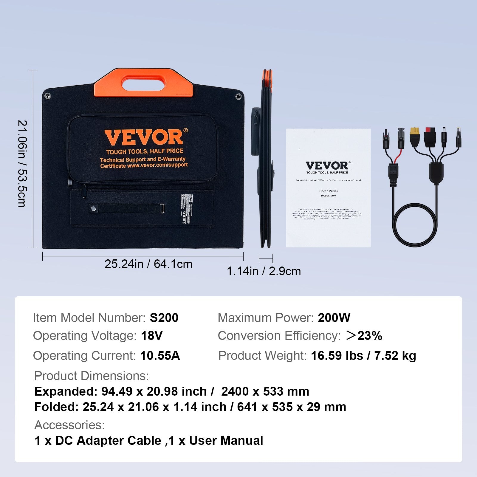 200W högeffektiv uteffekt: Släpp lös kraften på 200W med VEVOR bärbar monokristallin solpanel. Med en hög energiomvandlingsfrekvens på över 23 % uppfyller den snabbt din enhets laddningsbehov. Oavsett om du är hemma eller på språng, upplev effektiv laddning som håller dig uppe.