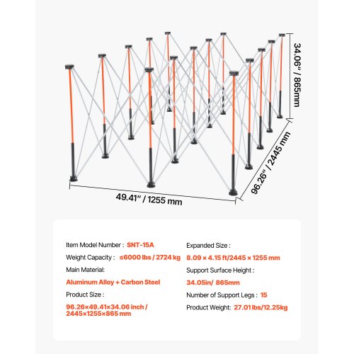Robust och stabil: Tillverkad med 15 aluminiumlegeringsstöd och förstärkta rör, klarar detta bärbara, hopfällbara arbetsställ upp till 2700 kg. Det har klarat trycktester, vilket ger tillförlitligt stöd för dina uppgifter och säkerställer långvarig hållbarhet.