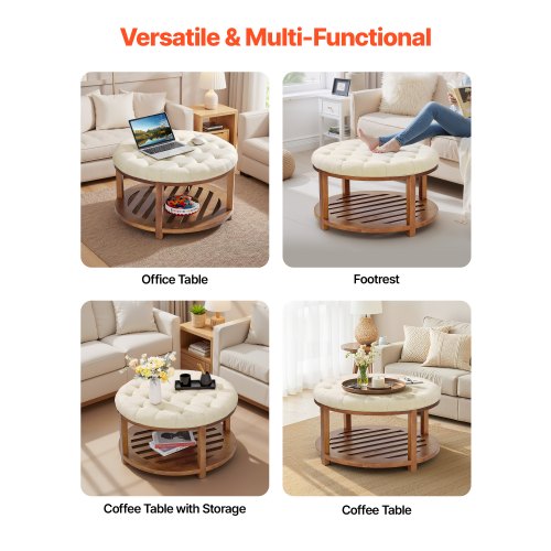 Stor rund ottomansk soffbord, 81 cm tuftat soffbord med massivt trähylla, massivt klädd fotstödsottoman i linne för sovrum vardagsrum, 147 kg, linnefärgad | EU