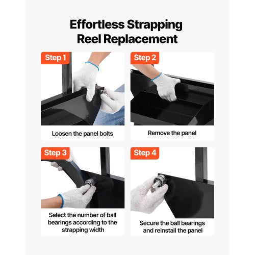 Smidig bandutmatning: Denna stålbandsutmatare är utrustad med metallkullager och gör hanteringen av tunga stålband enkel. Den minskar trassel och vridning och låter dig justera för olika bandbredder.