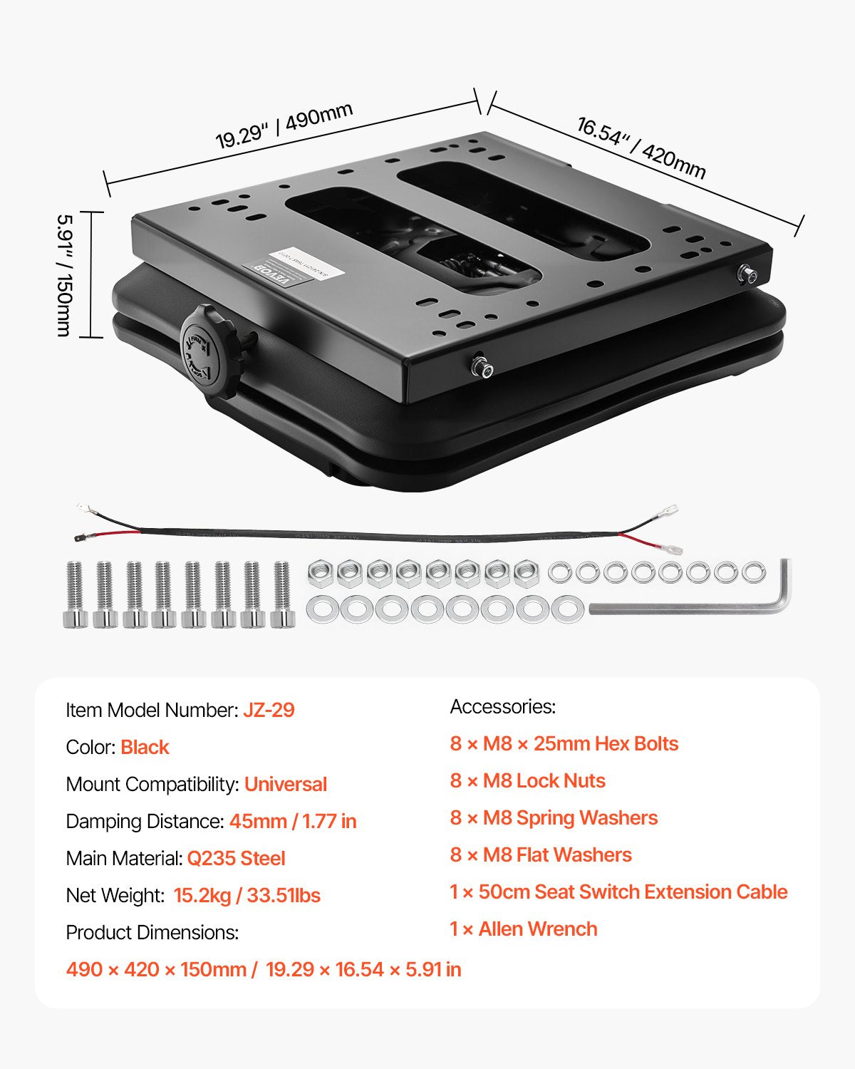 Mångsidig kompatibilitet: Med 8 ytterligare monteringshål passar denna universella sätesupphängning ett brett utbud av maskiner, inklusive gräsklippare, gaffeltruckar, traktorer och bulldozers. Det förenklar bytet av gamla fjädringssystem, vilket förbättrar både stabiliteten och användarvänligheten.