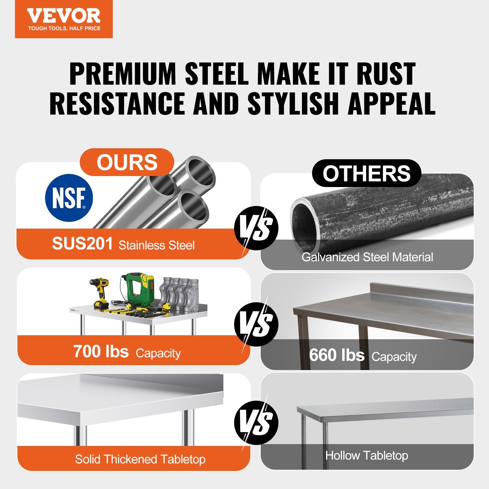 Högkvalitativt rostfritt stål: Detta arbetsbord, som mäter 24 x 24 x 40 tum, är tillverkat av SUS201 rostfritt stål för bordsskiva, hyllor och ben. Den erbjuder överlägsen rostbeständighet, ett elegant utseende och en slät yta som är lätt att rengöra med en enkel avtorkning. NSF-certifierad, den uppfyller stränga folkhälsostandarder, vilket säkerställer ett långvarigt skydd för din hälsa.